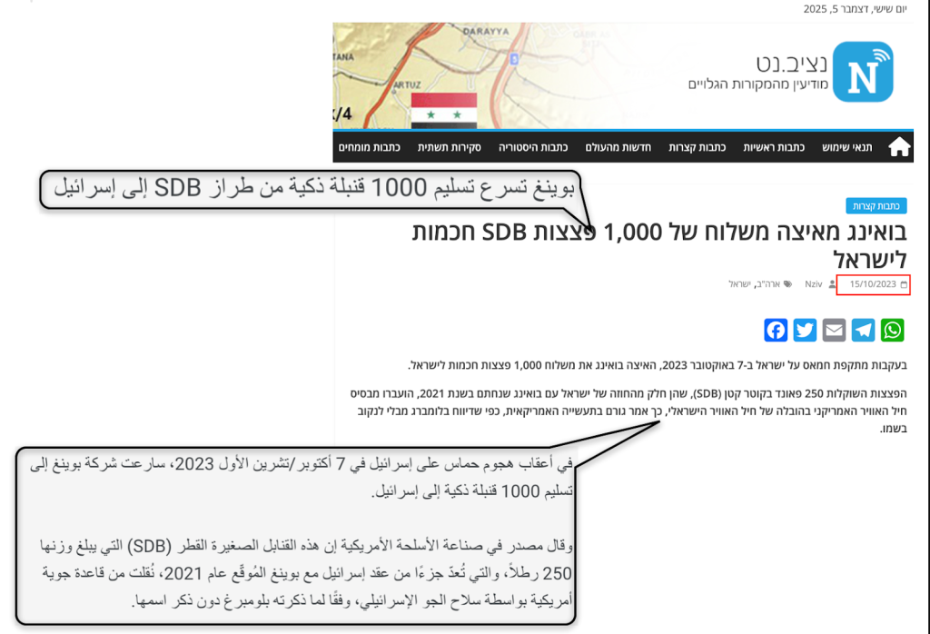 ولتأكيد حيازة إسرائيل لتلك القنبلة، رصدنا خبرا نشره نفس الموقع بتاريخ 15 أكتوبر 2023 حول تسريع تزويد تل أبيب بـ 1000 قنبلة ذكية من نفس الطراز ضمن صفقة تتجاوز 735 مليون دولار مع شركة بوينغ، ما يؤكد توفر هذا الطراز في الترسانة الإسرائيلية خلال الفترة التي سبقت تنفيذ العملية.