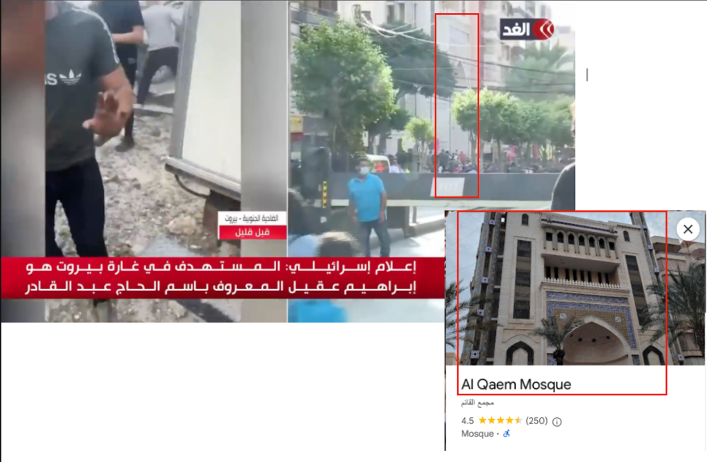 بتحليل المقاطع المصورة المنشورة لموقع الاستهداف، تبين أنه يقع في شارع الشيخ “راغب حرب” في حارة “حريك” بالضاحية الجنوبية.