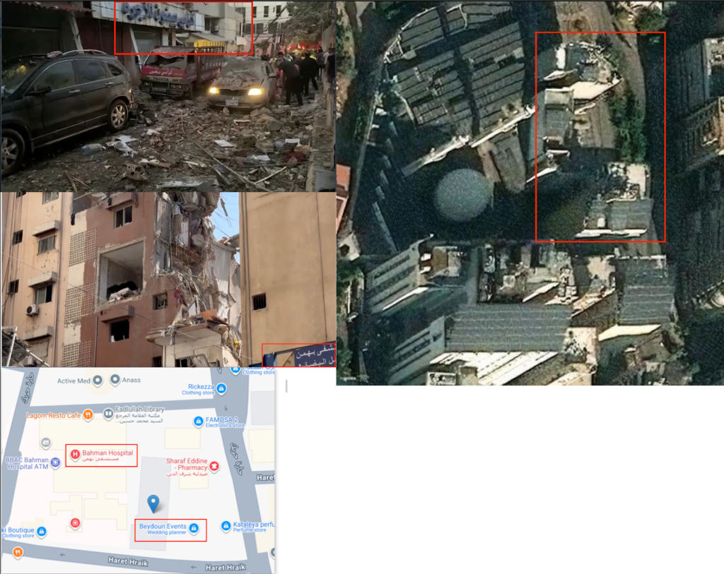 تبين أن المبنى يقع أمام “مستشفى بهمن” وبمراجعة صور القمر الصناعي، حددنا المبنى المدمر جزئيا والذي اغتيل فيه “فؤاد شكر”.