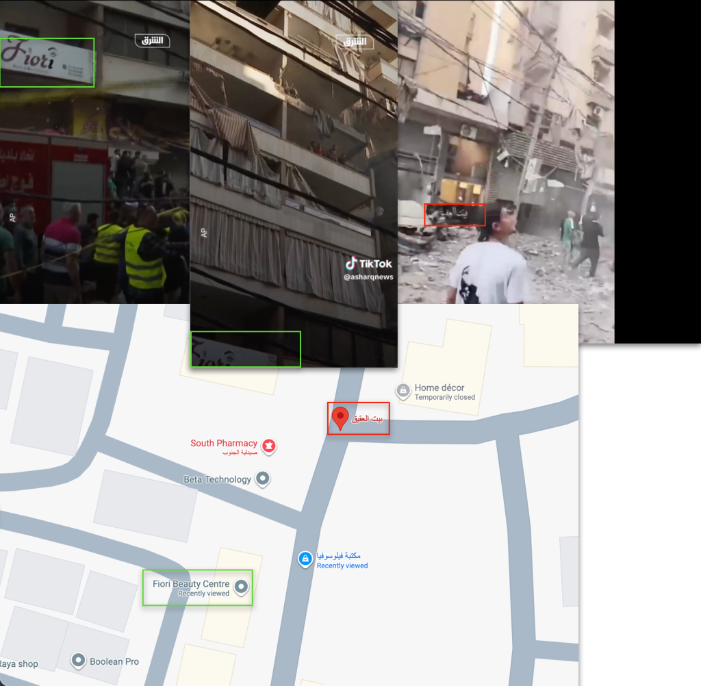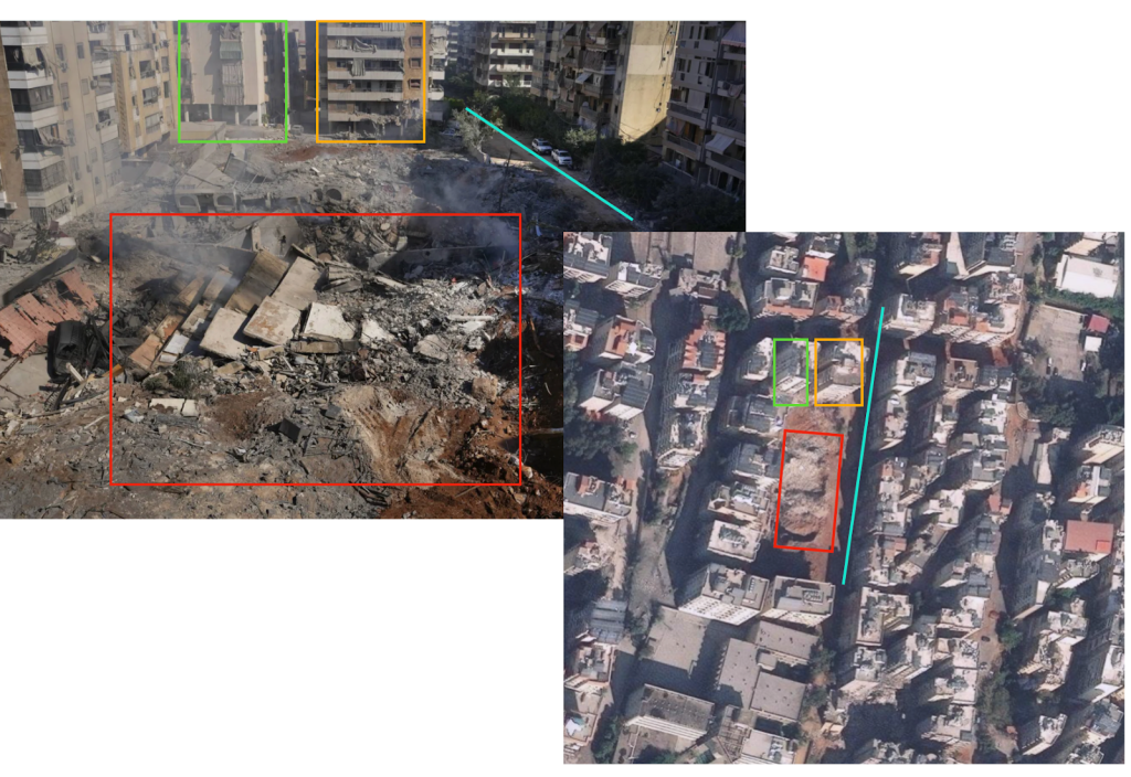 بتحليل عدد من المقاطع المصورة والصور التي نُشرت من موقع الاستهداف لتحديد الموقع في حارة “حريك”.