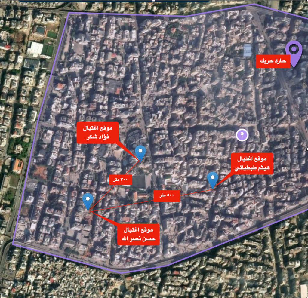 كما تبين أن موقع اغتيال “حسن نصر الله” يبعد ٣٠٠ مترا عن موقع اغتيال “فؤاد شكر” و٥٠٠ مترا عن موقع اغتيال “هيثم الطبطبائي”