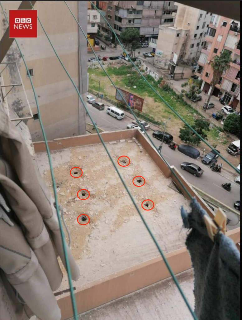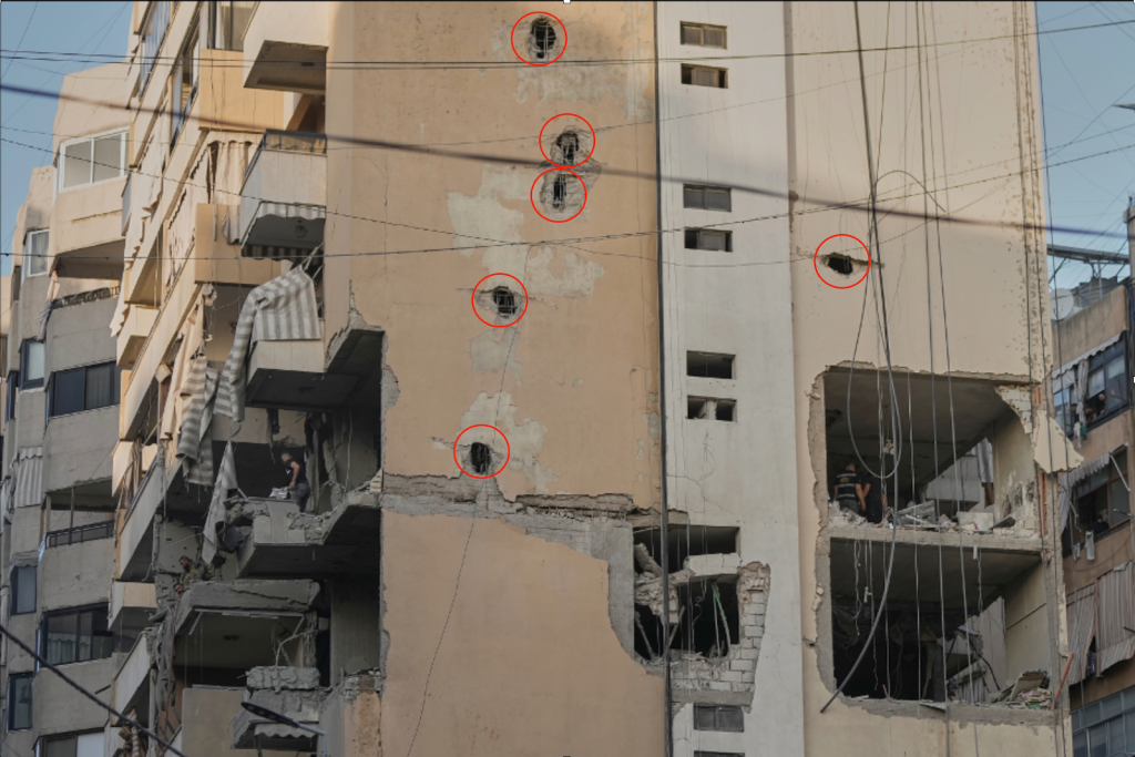 تكرر نمط اختراق المقذوف للمبنى عند مقارنته مع عملية اغتيال “صالح العاروري” في الضاحية حيث ظهرت فتحات دائرية متقاربة الحجم في سقف المبنى المستهدف.