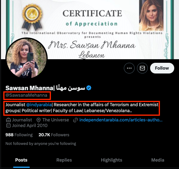 و بتحليل حساب “سوسن مهنا” نجد أنها صحفية تتبنى الرواية الإسرائيلية في أغلب منشوراتها ومداخلاتها مع القنوات التلفزيونية، كما يظهر في خطابها الإعلامي تبنيها الكامل لنزع سلاح حزب الله في لبنان والدعوة الى ذلك.