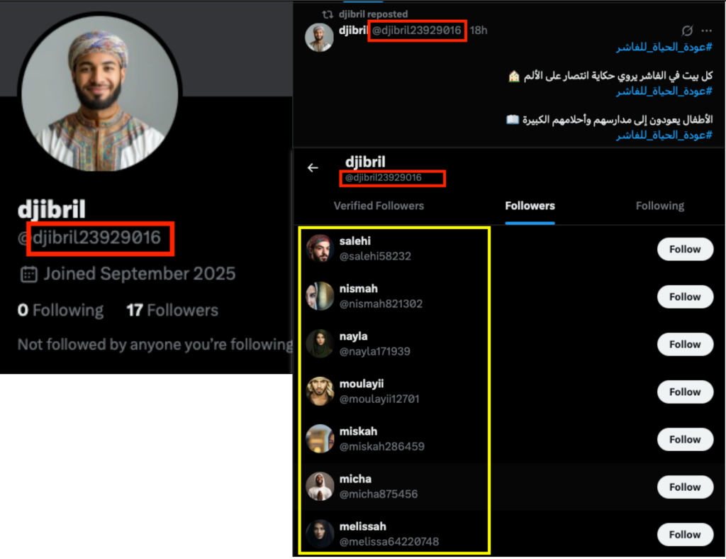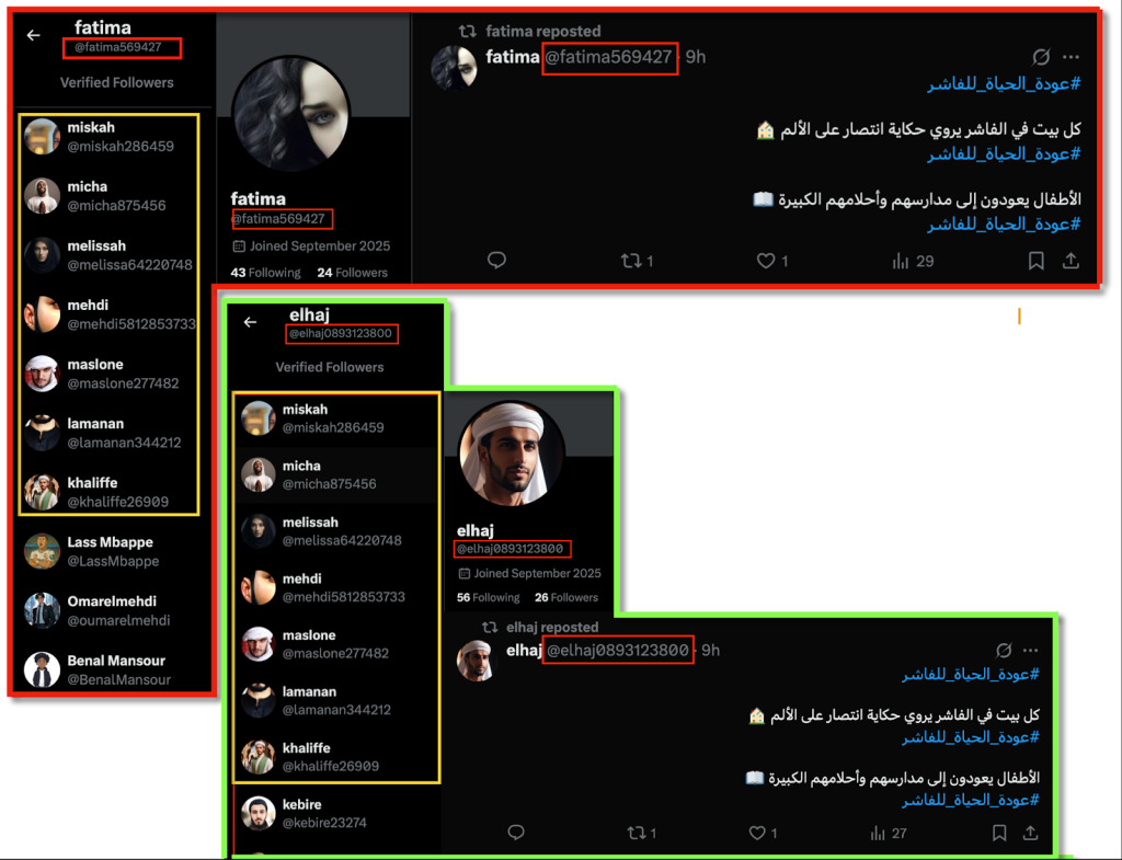 وجدنا أن كلا الحسابين أنشئا في سبتمبر ٢٠٢٥، وتتابعهما نفس الحسابات وينشران في نفس التوقيت ذات المنشورات، مما يعني أن عملية النشر والتحكم في الحسابات هي عملية مؤتمتة، وأكد ذلك أيضا أن معرفات الحسابات تحتوى على أرقام عشوائية مما يوحي أن الحسابات وهمية وهي ليست لشخصيات حقيقية.