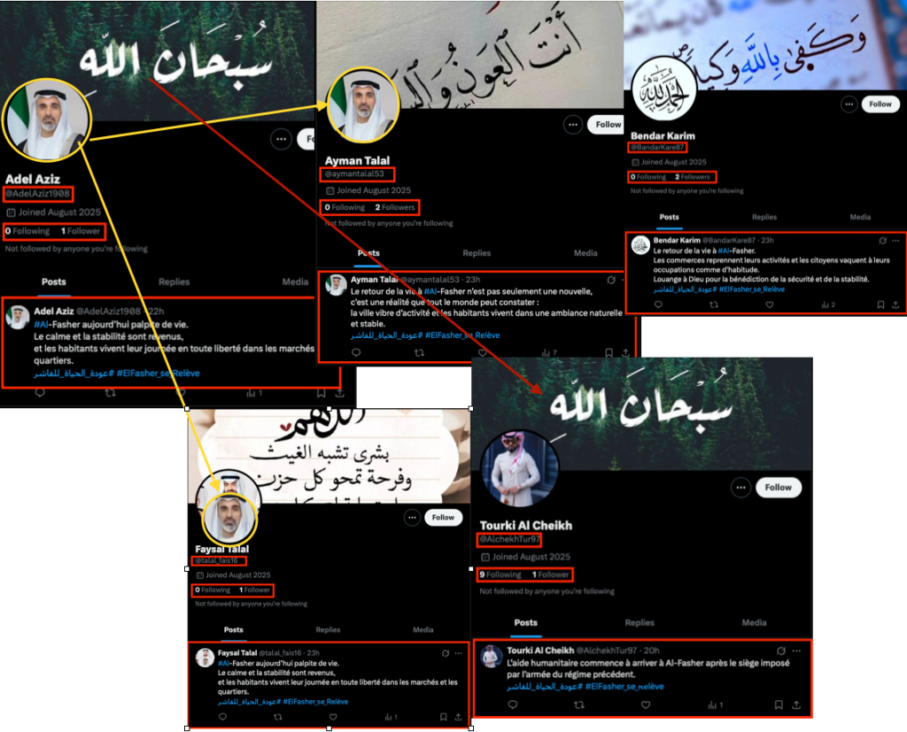 ارتباط الحسابات المشاركة في وسم الفاشر بحملة “محمود البلوشي” الإماراتية، وإعادة نشر نفس الحسابات الوهمية لمحتوى من حسابات موثقة محددة يكشف:
