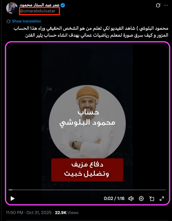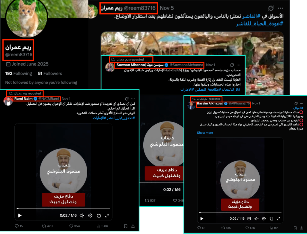 الغريب في حسابه أنه غير مهتم ولا يشارك الا بالأخبار التي تتعلق بالعراق، وعلى الرغم من ذلك شارك في ذلك الوسم، النقطة الأخرى هو محتوى مصور نشره على حسابه في ١ نوفمبر ضمن حملة بدأتها الإمارات في عبر منصاتها للتنصل من حساب يدعى “محمود البلوشي”.