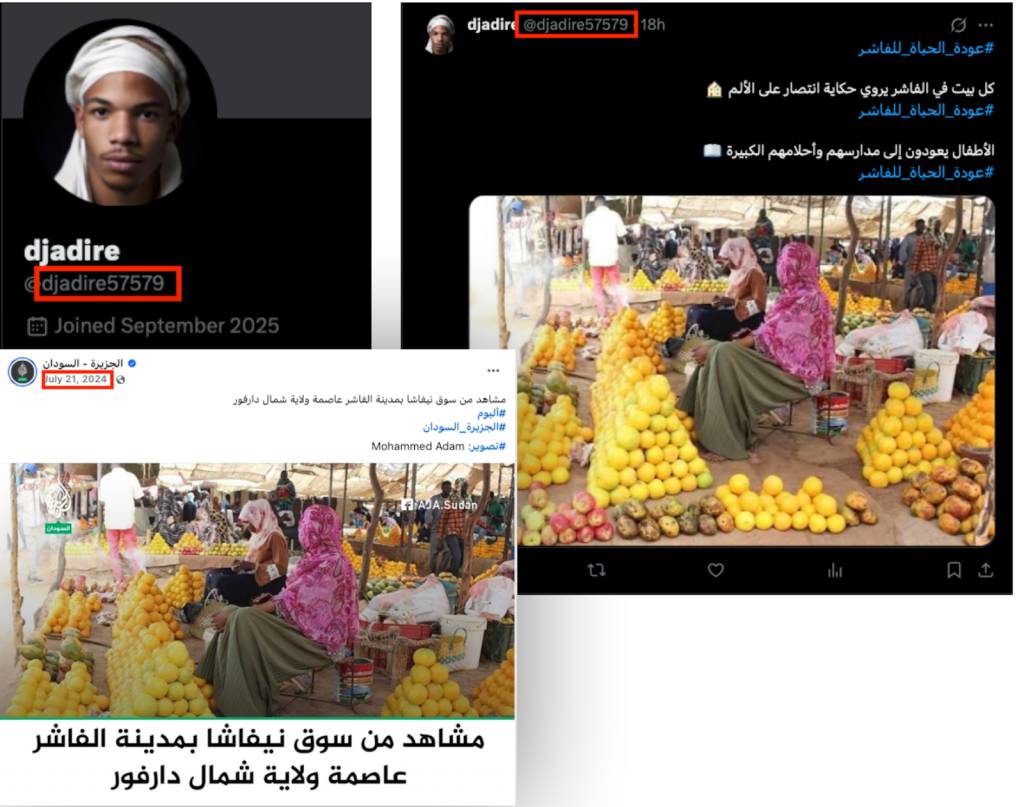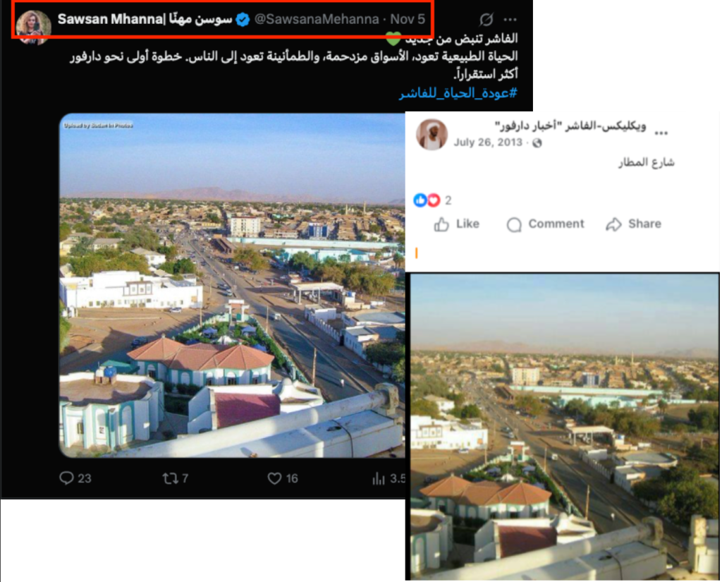 كما لاحظنا اعتماد المشتركين في الوسم على نشر صور مضللة لم تلتقط في مدينة الفاشر أو صور قديمة للإيحاء بأن الحياة تعود لمدينة الفاشر.