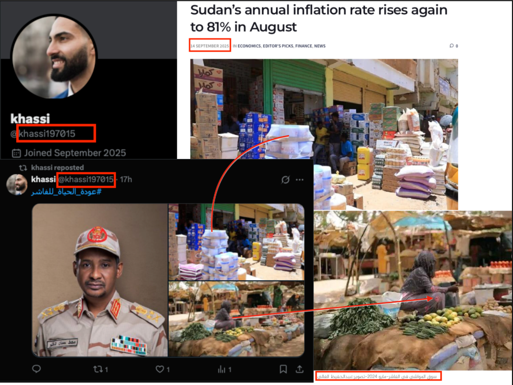 وبتحليل مشاركته في الوسم وجدناه قد استعان بصور مضللة في مشاركته فالصورة الأولى وجدناها قد نشرت في ١٤ سبتمبر، أي قبل الأحداث بشهرين تقريبا، أما الصورة الثانية تعود الى ٢٠٢٤ لأحد الأسواق في الفاشر.