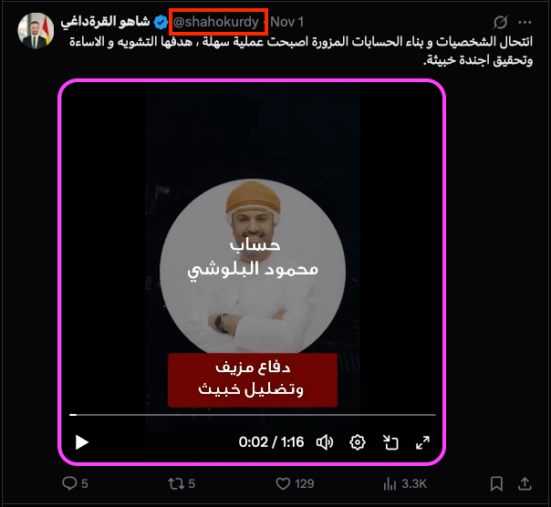 ما يؤكد تلك الفرضية ما نشره “عمر عبد الستار” وتطابق مع ما نشره “شاهو داغي” وهو المحتوى المصور الذي تتنصل به الإمارات والأذرع الإعلامية لها من حساب “محمود البلوشي” ، كما لاحظنا أيضا تشابه طريقة النشر٬ فقد نشر الحساب الفيديو مباشرة من حسابه وليس إعادة تغريد.