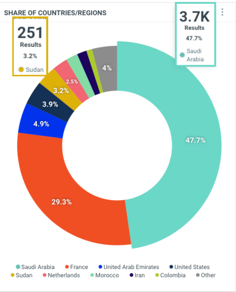 و بتحليل الأماكن الجغرافية للحسابات المشاركة في الوسم توصلنا إلى أن نصف التغريدات تقريبا تم نشرها من حسابات سعودية٫ على عكس الحسابات السودانية نفسها فلم تتجاوز نسبتها ال ٣٪ بما يعدل 251 منشور تقريبا، مما يعني أنها حملة موجهة لا تعكس حقيقة الأمر في السودان.