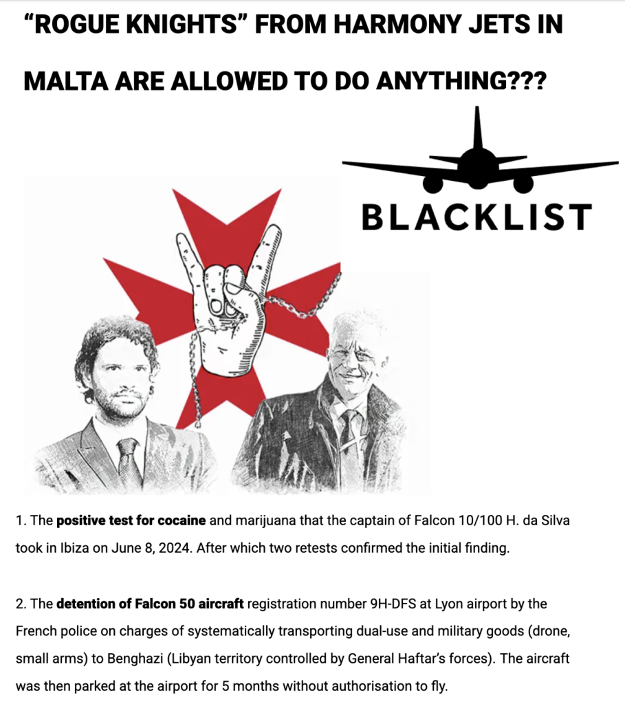 وأشار الموقع إلى أن الشرطة الفرنسية احتجزت طائرة فالكون 50 ذات رقم التسجيل 9H-DFS والتي تحطمت بالأجواء التركية، في مطار ليون على خلفية الاشتباه في نقل الطائرة لمواد ذات استخدام مزدوج ومواد عسكرية من بينها طائرة بدون طيار وأسلحة خفيفة بشكل منهجي إلى بنغازي (وهو نفس الاتهام تقريبا الذي أثبته تقرير الخبراء التابع للأمم المتحدة). ووفقًا للرواية المنشورة، بقيت الطائرة محتجزة لمدة خمسة أشهر دون تصريح طيران، ولم يصدر عن الشركة أو رئيسها أي تعليق.