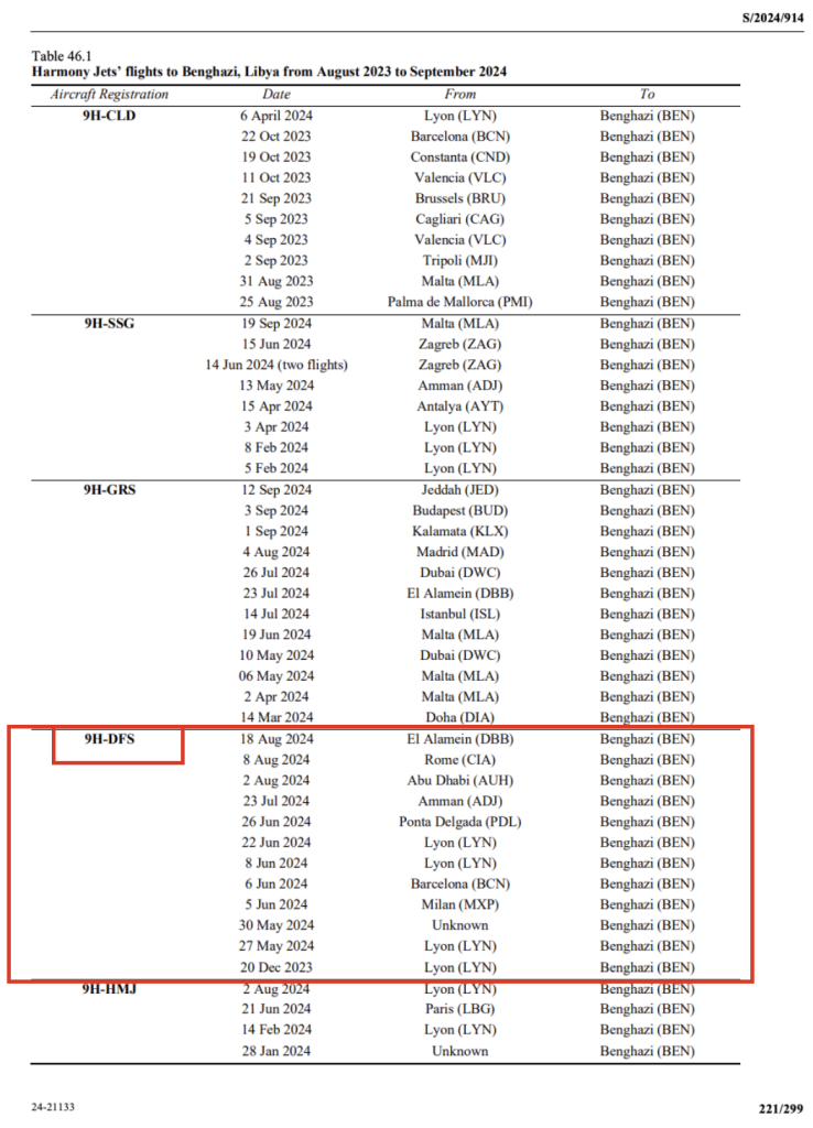 وبحسب تقرير لجنة الخبراء، فإن كامل أسطول “Harmony Jets” (الـطائرات الخمسة) شارك في تسيير هذه الرحلات ومنهم الطائرة المنكوبة المسجلة برمز9H-DFS .