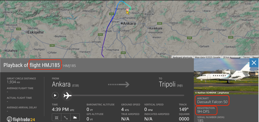 بالبحث عن الرحلة التي كان الطاقم الليبي يستقلها، نجد أنهم كانوا على متن الرحلة رقم HMJ18 المتوجهة من أنقرة إلى طرابلس، في طائرة رجال أعمال من طراز: Falcon 50، وهي طائرة فرنسية الصنع، أنتجتها شركة داسو للطيران في سنة 1976.