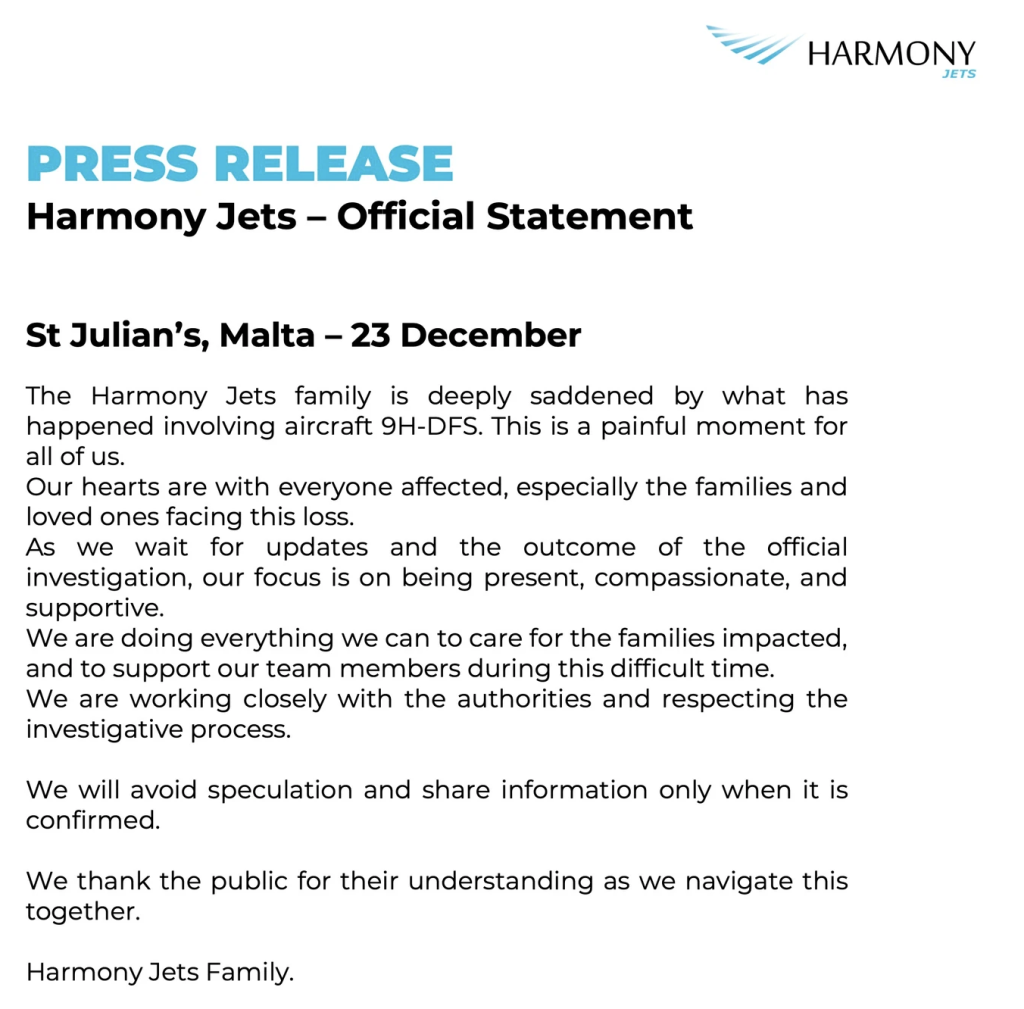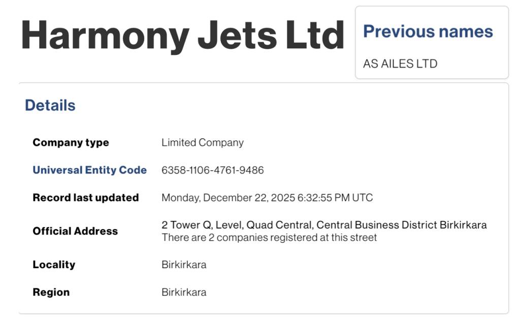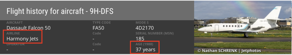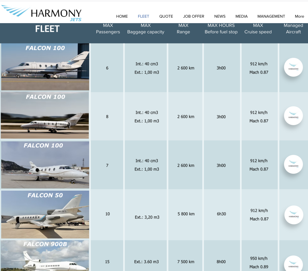 وبالبحث المعمق عن الشركة المشغلة، توصلنا إلى أنها مسجلة رسميا في مالطا تحت اسم: HARMONY JETS LIMITED واسمها السابق AS AILES LTD. ويقع مقرها الرئيسي في مدينة بيركيركارا Birkirkara المالطية.