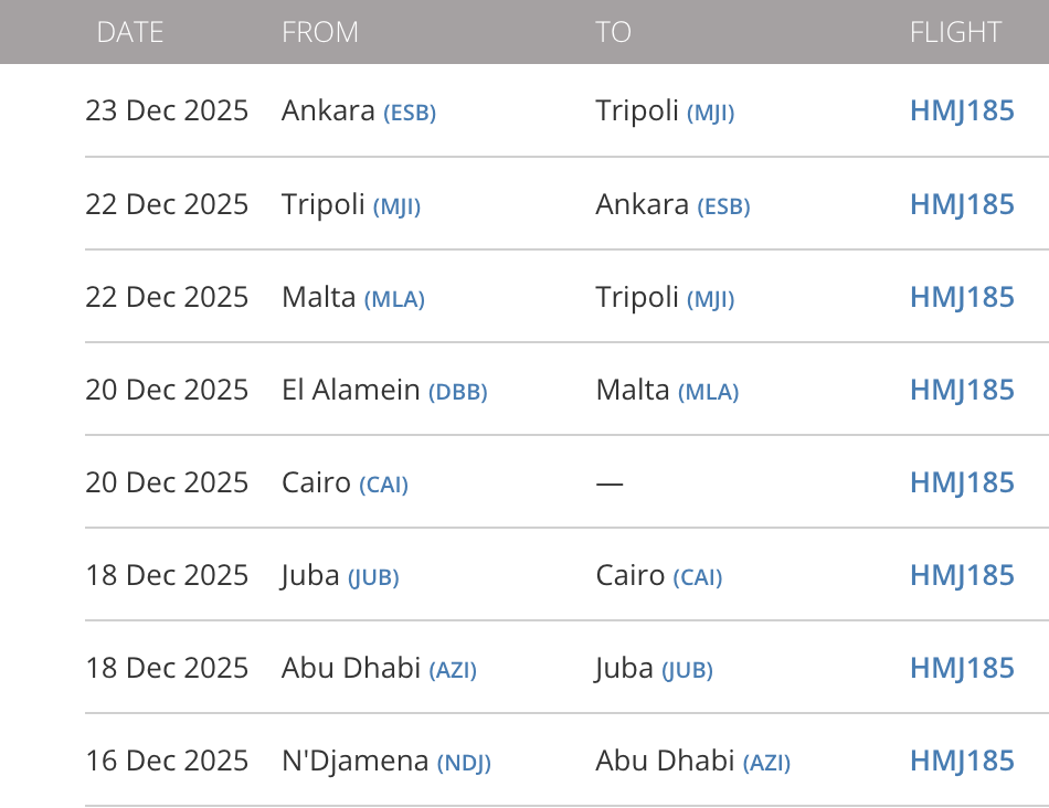 وبالاطّلاع على سجلّ تحركات الطائرة خلال الأسبوع الماضي، يتضح أنها نفّذت سلسلة رحلات متعدّدة إلى وجهات مختلفة، غالبيتها في العالم العربي؛ إذ حطّت في تشاد وأبوظبي وجنوب السودان ومصر، كما زارت مالطا وأنقرة، قبل أن تتجه إلى طرابلس في رحلتها الأخيرة قبل أن تتحطم في الطريق إليها؟