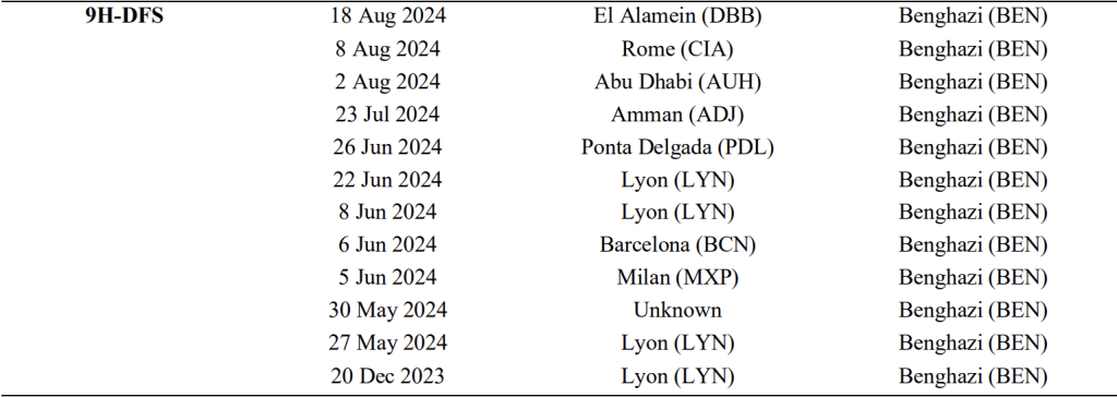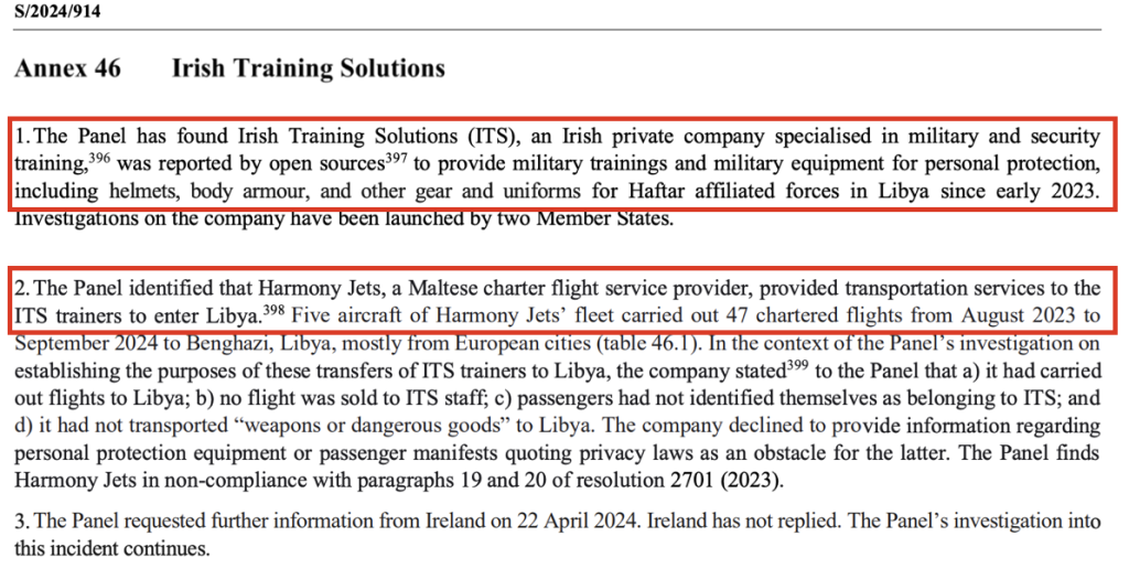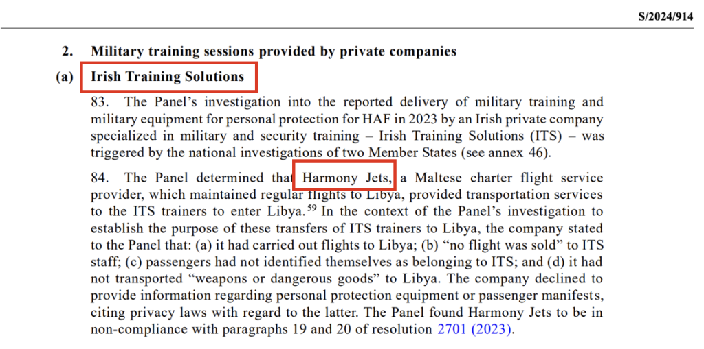 فووفقا للتقرير قامت الشركة بتسيير رحلات جوية منتظمة إلى ليبيا، وقدمت خدمات نقل لمدربين تابعين لشركة Irish Training Solutions عبر 47 رحلة سيرتها إلى بنغازي لصالح قوات مرتبطة ب”خليفة حفتر” بين أغسطس 2023 وسبتمبر 2024، معظمها قادم من مدن أوروبية، دون الالتزام بالفقرتين 19 و20 من قرار مجلس الأمن رقم 2701 (2023)، اللتين تلزمان الكيانات بالتعاون الكامل مع لجان العقوبات وتقديم المعلومات المطلوبة.