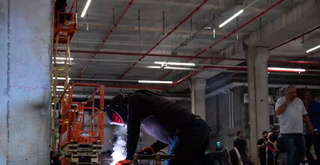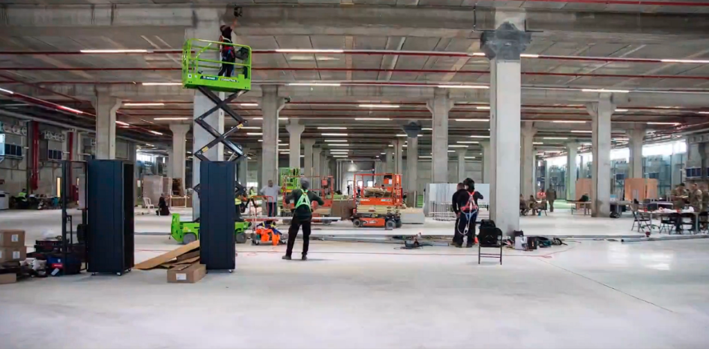 تطابقت صورة للقاعة الداخلية للمبنى، نشرها حساب الشركة على منصة “فيسبوك” مع صورة لتجهيز مركز التنسيق قبل افتتاحه، إذ تطابق شكل الأعمدة وارتفاع السقف والألوان في لصورتين.