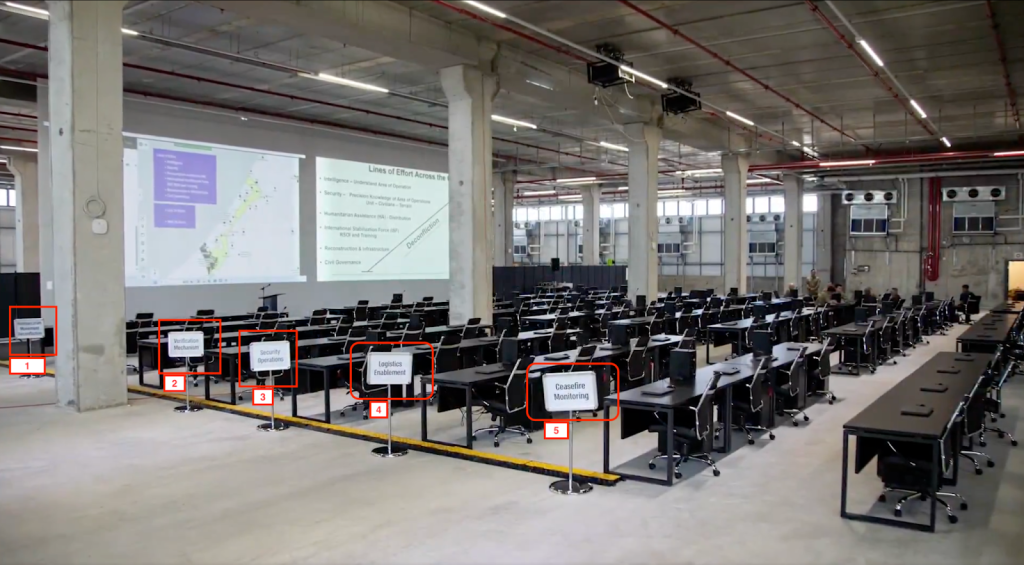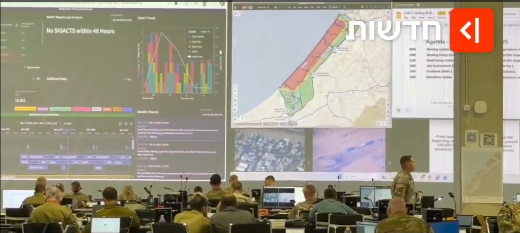 كما نشر حساب القيادة المركزية الأمريكية صورا أظهرت جزءا من القاعة الكبيرة تحتوي على مجموعة كبيرة من المكاتب أمام شاشة ضخمة يظهر عليها خريطة لقطاع غزة.