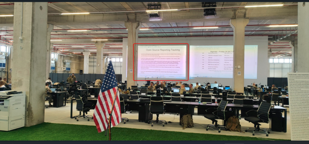 كما أظهرت إحدى الصور استخدام القوات الأمريكية بالمركز أحد البرامج والذي بالبحث عنه تم التوصل إلى أنه برنامج Palantir، وهو أداة برمجية تنتجها شركة تكنولوجيا أمريكية متخصصة في بناء أنظمة تحليل بيانات معقدة تُستخدم في الأمن القومي، والاستخبارات، والدفاع، والخدمات الصناعية.