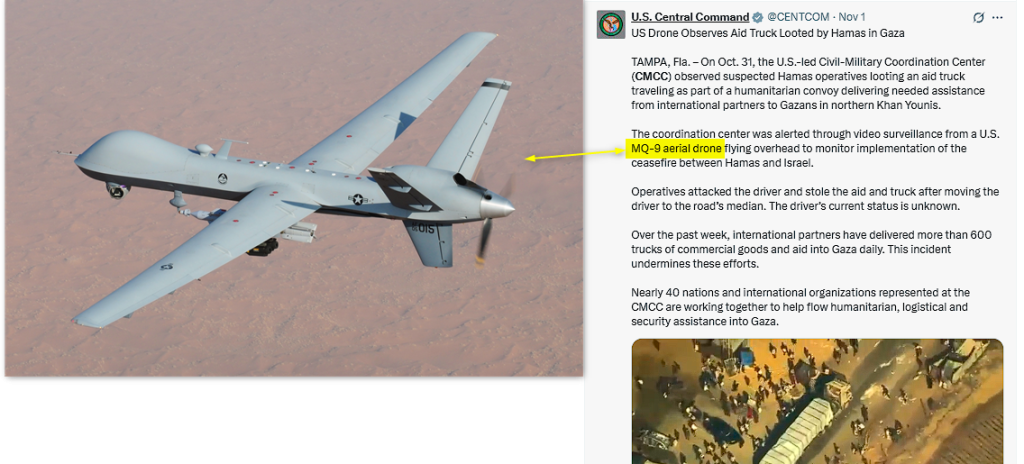 ذكرت تغريدة أخرى لحساب القيادة المركزية الأمريكية (سينتكوم) أن مركز التنسيق المدني العسكري يستخدم مسيرات من نوع (MQ-9) لمراقبة وقف إطلاق النار؛ وهي طائرة قتالية بدون طيار، تُستخدم لتنفيذ ضربات دقيقة، والقيام بمهام استطلاع طويلة المدى. وقداستخدمتها الولايات المتحدة في تنفيذ هجمات على مواقع في أفغانستان، واليمن.