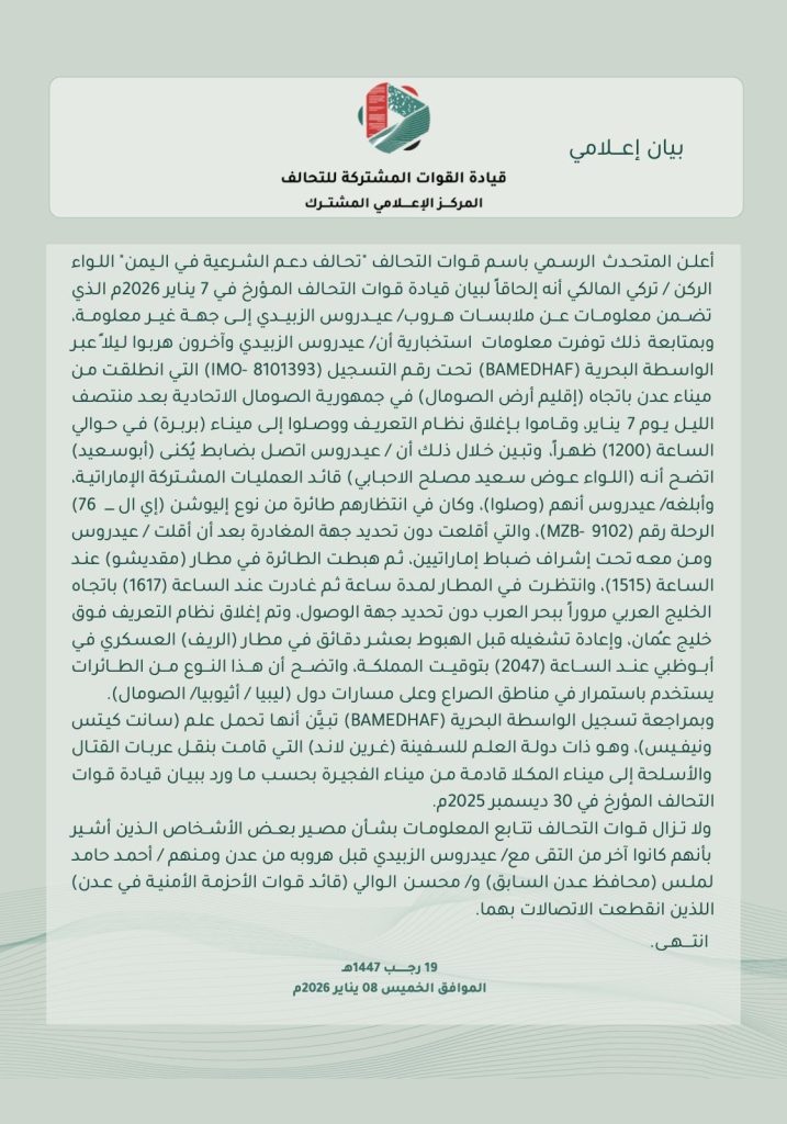 وأوضح المالكي أن المجموعة وصلت إلى “ميناء بربرة” ظهر اليوم التالي، قبل أن يتواصل الزُبيدي مع ضابط يُكنّى “أبو سعيد”، قال التحالف إن هويته تبيّن أنها تعود إلى “اللواء عوض سعيد مصلح الأحبابي” قائد العمليات المشتركة الإماراتية، لإبلاغه بوصولهم. وأضاف البيان أن طائرة كانت بانتظار الفارين أقلعت بهم تحت إشراف ضباط إماراتيين، من دون تحديد جهة الإقلاع.