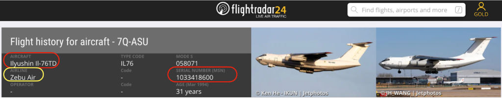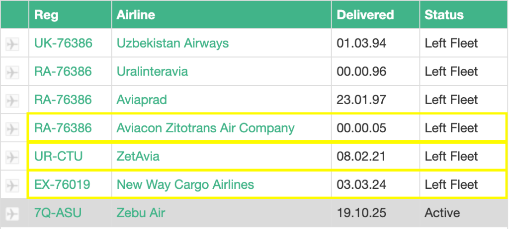 بمراجعة القائمة السابقة، يتبيّن أن الطائرة كانت ضمن أسطول شركة Aviacon Zitotrans خلال الفترة الممتدة من 2005 حتى 2021. و Aviacon Zitotrans هي شركة روسية تأسست عام 1995، قبل أن يُدرج اسمها -إلى جانب اسم مالكها- على قوائم العقوبات الأمريكية والأوروبية في عام 2023.