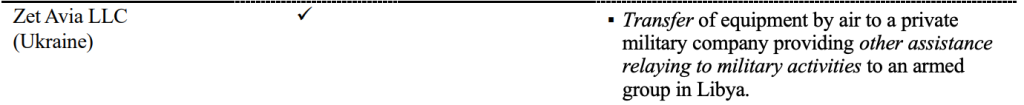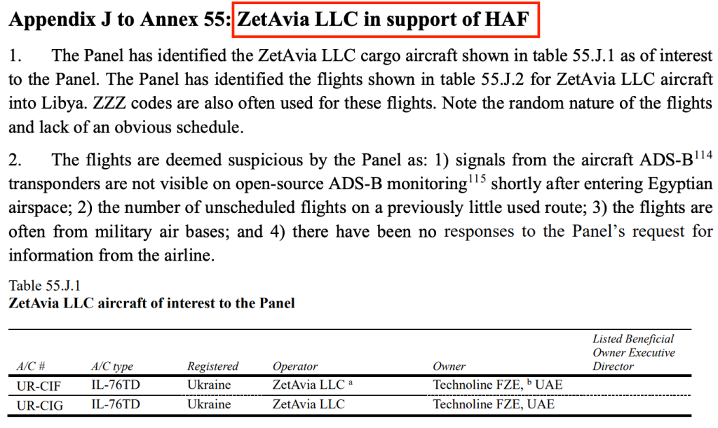وتأكدت هذه الاتهامات بعد أن وجهت لجنة الخبراء المعينة من مجلس الأمن فيتقريرها الصادر في مارس ٢٠٢١ اتهامات لشركة ZetAvia بتسهيل نقل دعم عسكري من الإمارات العربية المتحدة إلى قوات الجنرال خليفة حفتر في شرق ليبيا خلال 2019-2020، مما يشكل انتهاكاً لحظر الأسلحة بموجب قرار مجلس الأمن 1973 (2011).