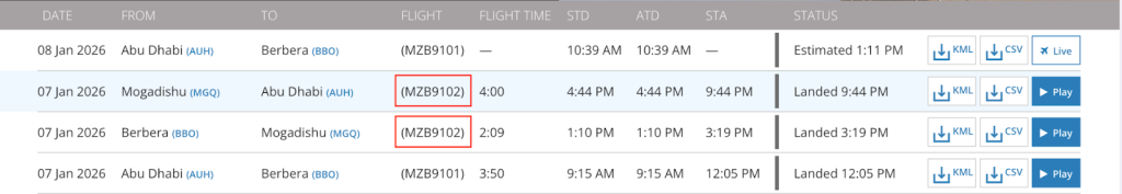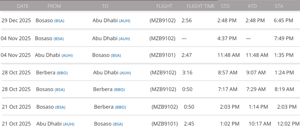 وبمراجعة سجلّ الرحلات السابقة للطائرة، يتضح أنها نفّذت رحلات متكررة بين مطار أبوظبي في الإمارات وكلٍّ من مطار بوصاصو ومطار بربرة.