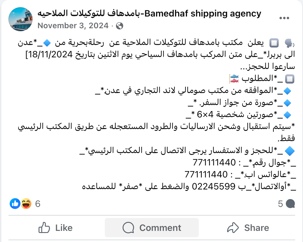 وكانت الصفحة تنشر إعلانات بشكل دوري عن رحلات (عدن-بربرة) ولكنها توقفت عن النشر منذ نوفمبر ٢٠٢٤
