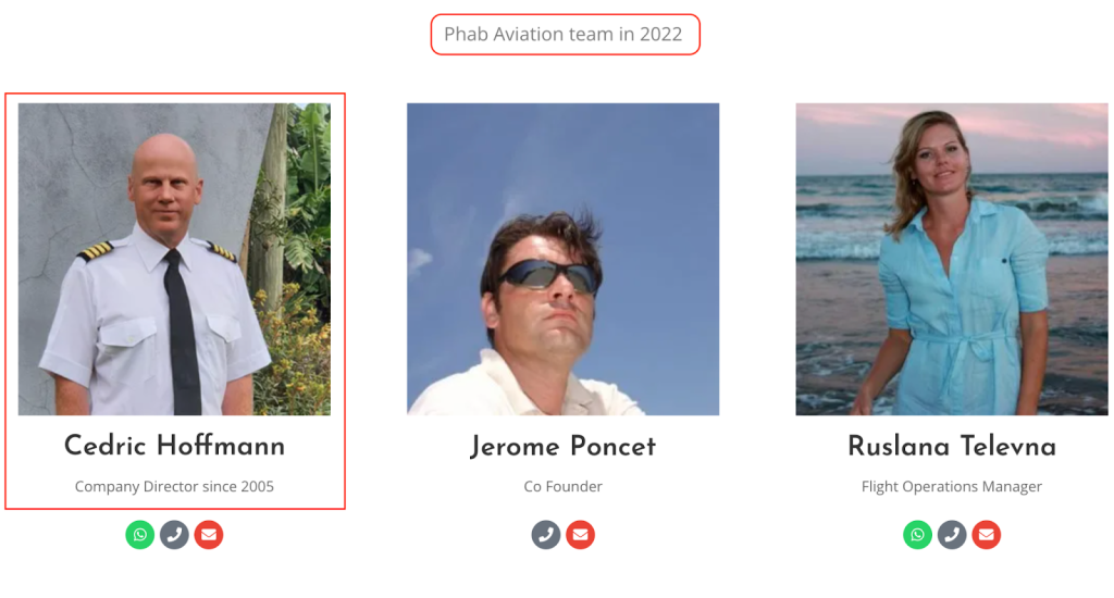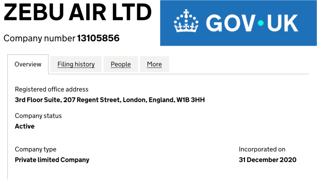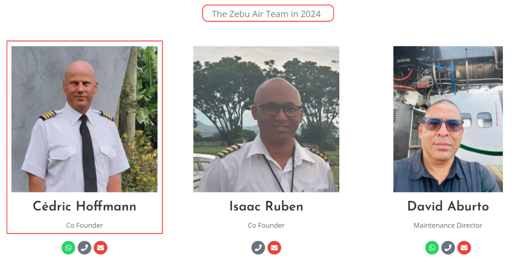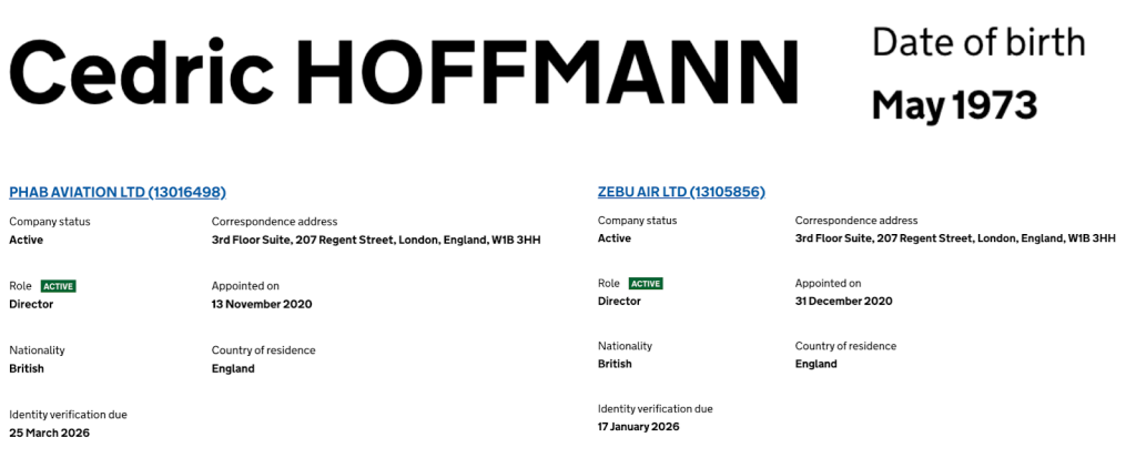 يتولى إدارة الشركة شخص يُدعى سيدريك هوفمان (Cedric HOFFMANN). وبالتحقق من بياناته، تبيّن أنه من مواليد مايو ١٩٧٣، ومسجّل بصفته مديرًا لشركة ZEBU AIR LTD. كما يدير شركة أخرى تحمل اسم PHAB AVIATION LTD، وقد سُجِّل مديرًا للشركتين خلال فترة زمنية متقاربة جدًا؛ إذ تم تسجيله مديرًا للأولى في نوفمبر ٢٠٢٠، وللثانية في ديسمبر ٢٠٢٠.