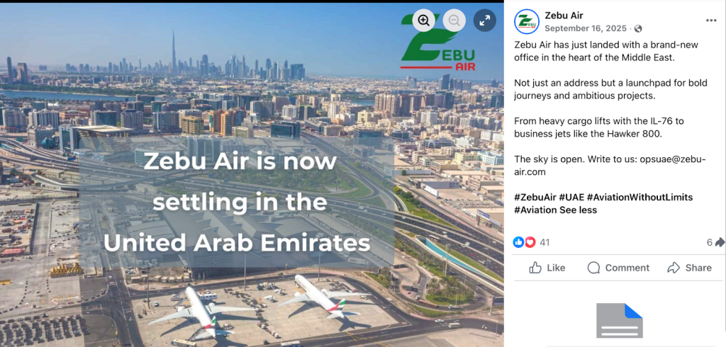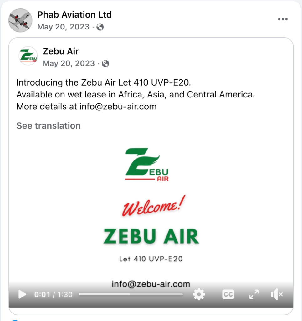 وهذا ما يفسر قيام صفحة PHAB AVIATION بإعادة نشر منشورات على منصة الفيسبوك من حساب شركة ZEBU AIR.