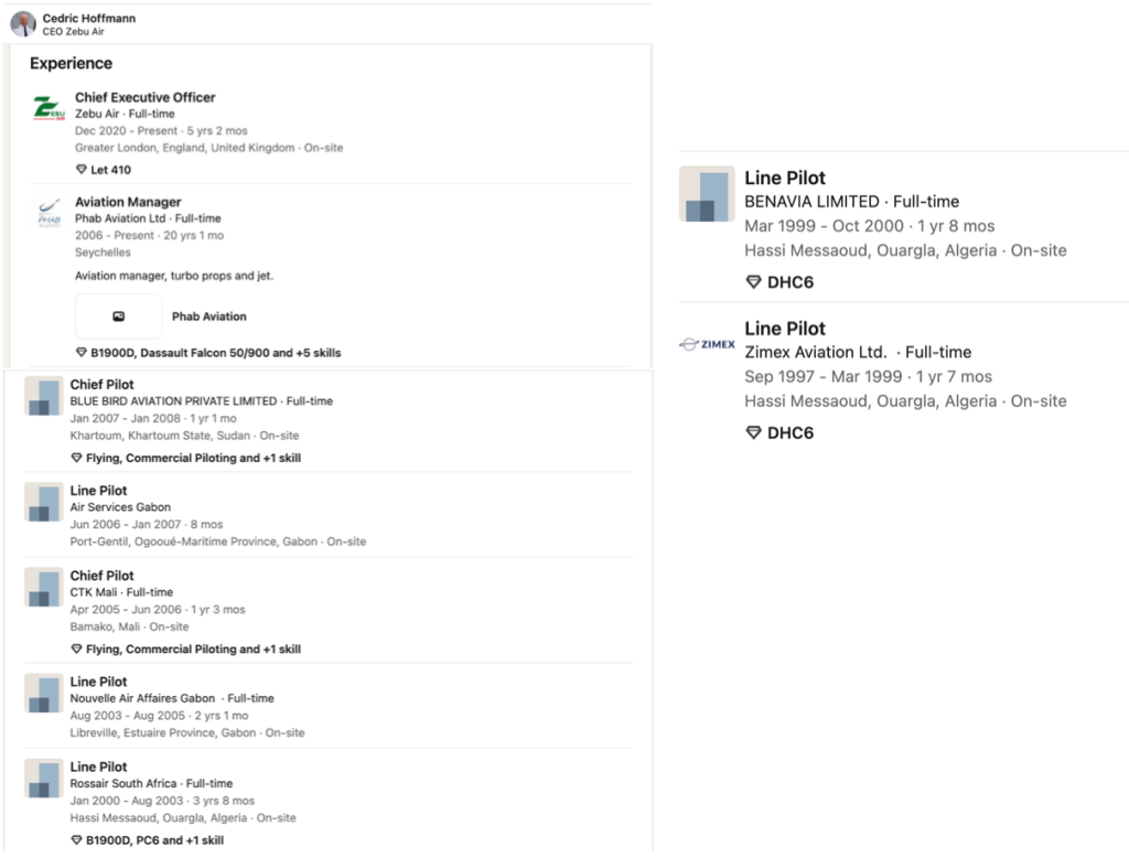 وعلى ما يبدو أن الرجل طيّارا مخضرما إذ يمتلك خبرة تمتد لنحو 35 عامًا في مجال الطيران، وقد عمل في عدة دول من بينها السودان وموريتانيا والجزائر وأنغولا والجابون ومالي، وفقًا لما تعرضه قائمة خبراته على حسابه في لينكدإن.