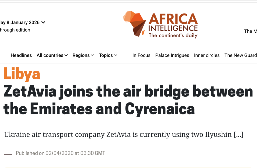 و”ZetAvia” هي شركة أوكرانية تأسست عام ٢٠٠٩، وأيضا طالتها العديد من الاتهامات تتعلق بضلوعها في نقل أسلحة وعتاد من الامارات لصالح قوات خليفة حفتر في ليبيا؛ ففي ابريل ٢٠٢٠ ذكر موقع “أفريقيا انتجلنس” أن الشركة كان لها دورا في بناء جسر جوي يربط بين الامارات ومدينة برقة الليبية (الواقعة تحت سيطرة قوات حفتر).