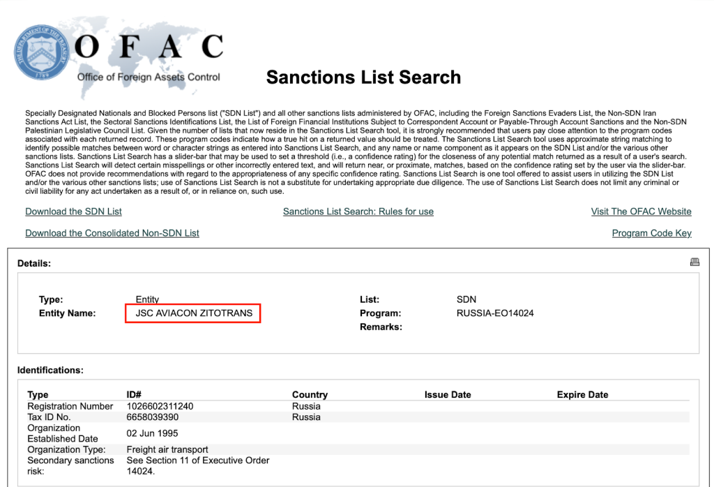 وجاء إدراج الشركة ضمن منظومة العقوبات الدولية على خلفية اتهامات بدعم المجهود العسكري الروسي؛ إذ صنّفتها وزارة الخزانة الأمريكية في 26 يناير 2023 على قائمة SDN بموجب الأمر التنفيذي 14024، مشيرةً إلى أن الشركة تولّت شحن صواريخ ورؤوس حربية وقطع غيار لمروحيات لدعم الجيش الروسي حول العالم، بما في ذلك نقل معدات عسكرية إلى وجهات مثل فنزويلا ودول في أفريقيا. وفي اليوم نفسه، فرضت بريطانيا عقوبات مماثلة، فيما أدرجتها كندا ضمن حزمة عقوبات في أوائل فبراير 2023، بينما شملها الاتحاد الأوروبي ضمن الحزمة التاسعة من عقوباته المعتمدة أواخر ديسمبر 2022 والتي بدأ تطبيقها في يناير 2023.