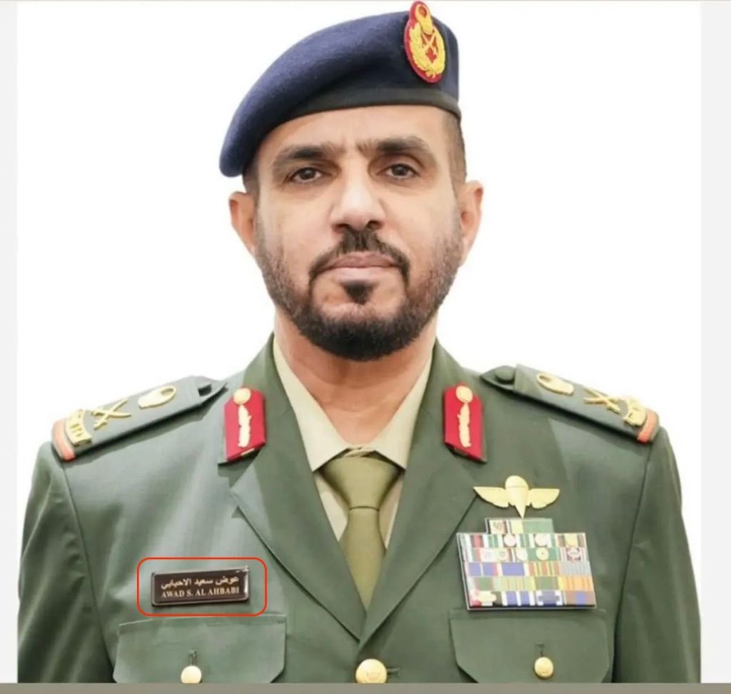 و”اللواء الركن عوض سعيد بن مصلح الأحبابي” هو أحد أبرز القيادات العسكرية في دولة الإمارات، ويشغل حالياً منصب قائد العمليات المشتركة بوزارة الدفاع، وكان قد شغل سابقاً منصب نائب قائد العمليات المشتركة، إضافة إلى توليه مهام قيادية ميدانية في مناطق عمليات مختلفة، من بينها اليمن.