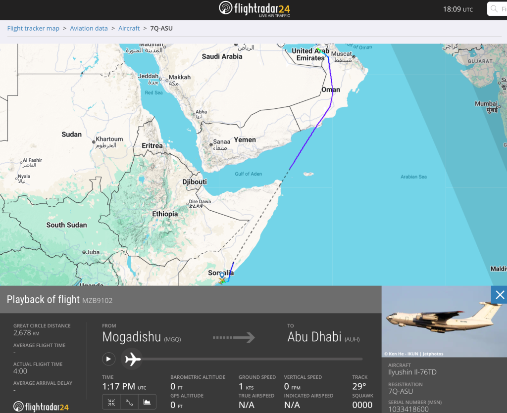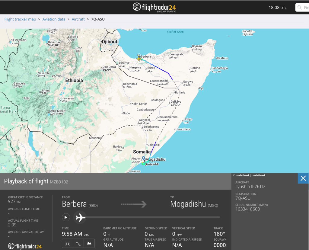 بالبحث عن مسار الطائرة المذكورة، تبيّن أنها أقلعت من أبوظبي ووصلت إلى مطار بربرة عند الساعة 12:00 ظهرًا (بالتوقيت المحلي لليمن)