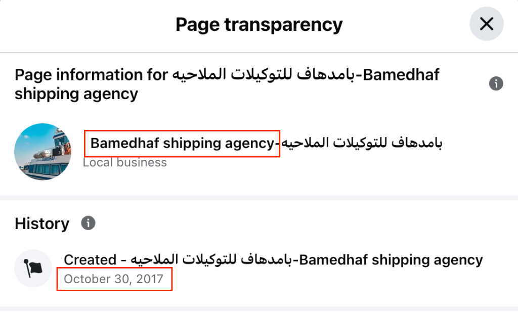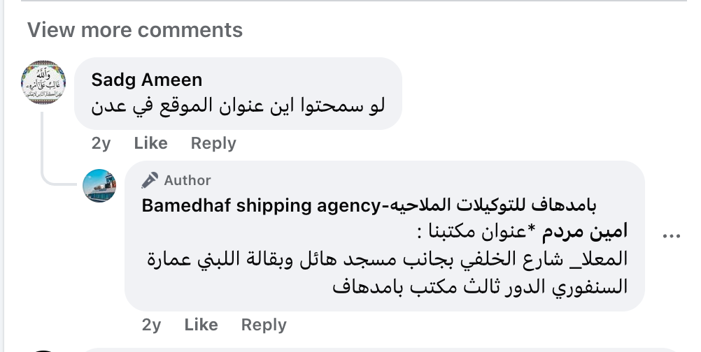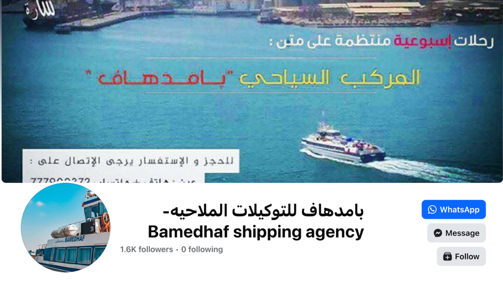 وبالبحث عن المدير التجاري للسفينة وجدنا حساب على منصة فيس بوك باسم نفس الشركة المذكورة في سجلات تسجيل السفينة ( Bamedhaf shipping agency) والصفحة مؤسسة بتاريخ ٢٠١٧