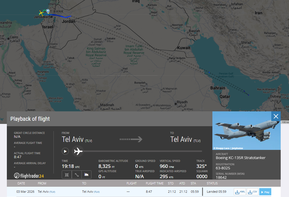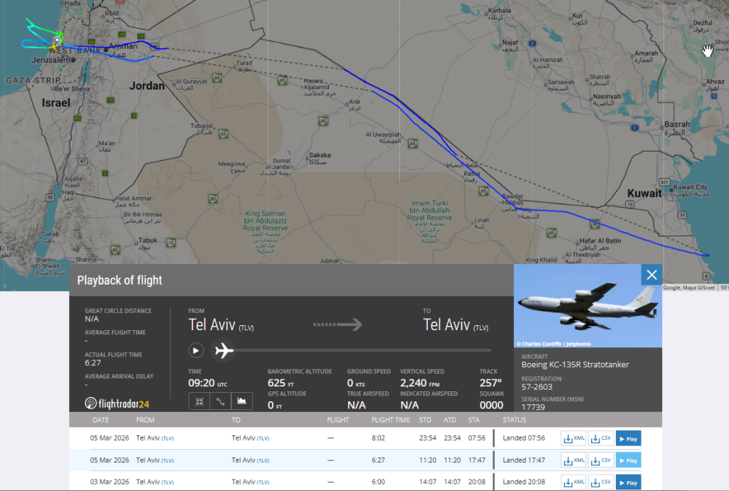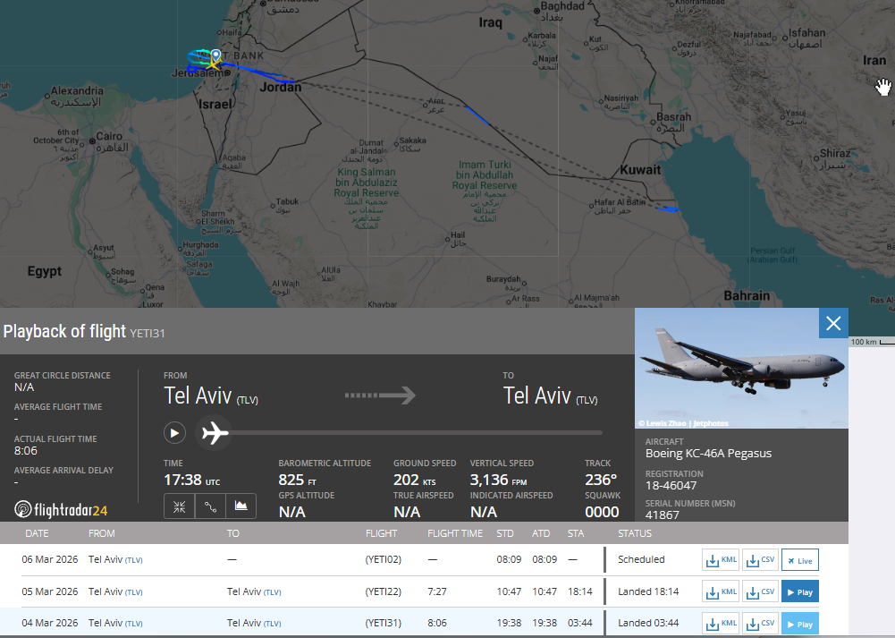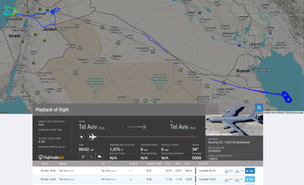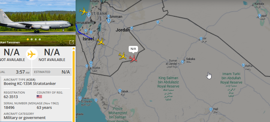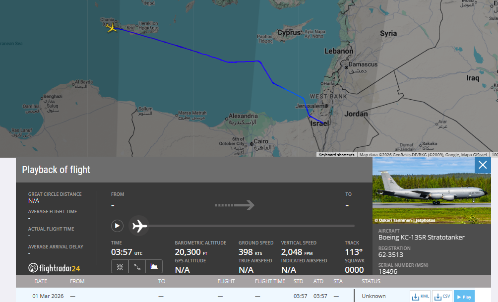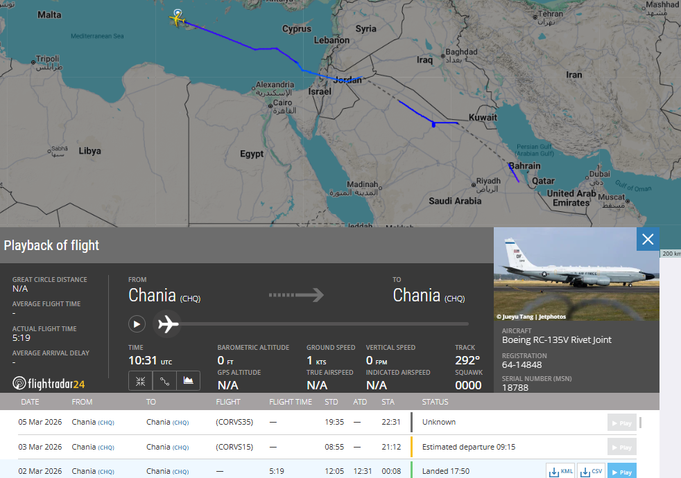 ففي الأول من مارس، اليوم الثاني للحرب على إيران، رصدنا طائرة أمريكية للتزود بالوقود، تحمل رقم تسجيل 623513، أقلعت من قاعدة Chania International Airport (أو IOAKannis Airport)، وهي قاعدة جوية يونانية مزدوجة الاستخدام (مدني وعسكري) في جزيرة كريت، جنوب غرب مدينة خانيا (Chania) بحوالي 14 كم الشرقية. وعبرت المجال الأردني نحو السعودية، ثم اختفت من على الرادار على الحدود الأردنية السعودية.