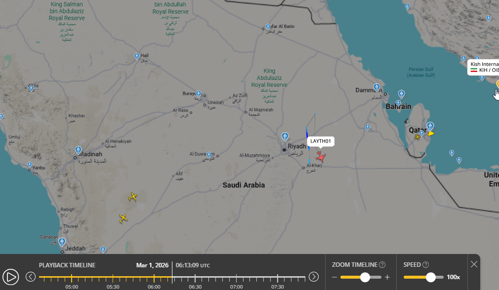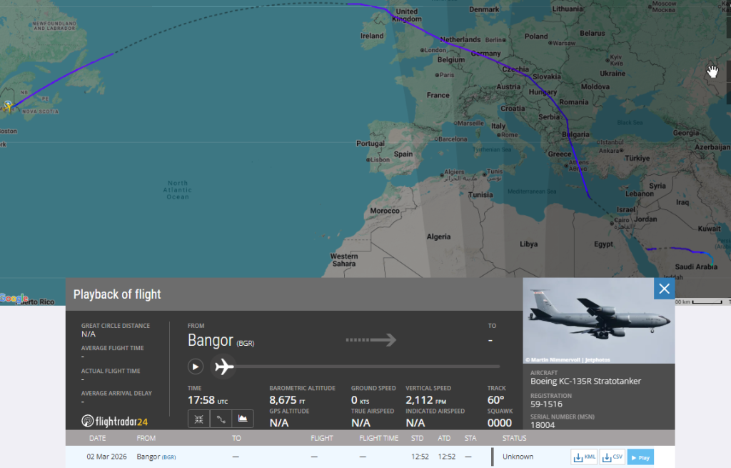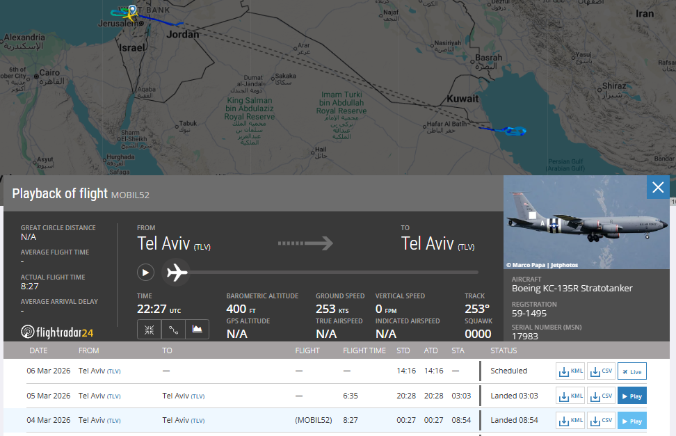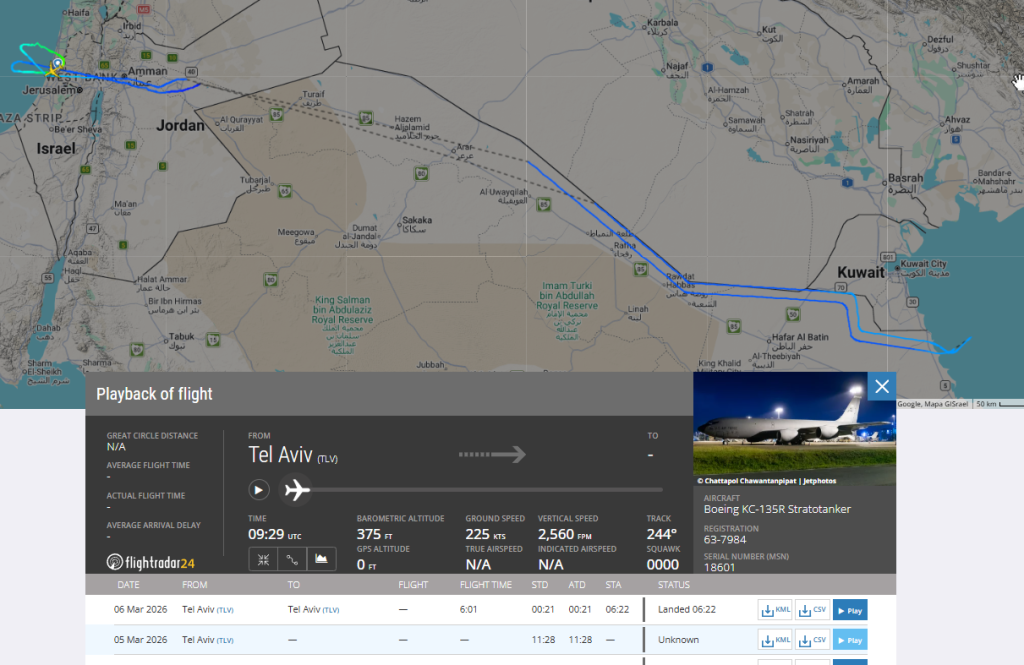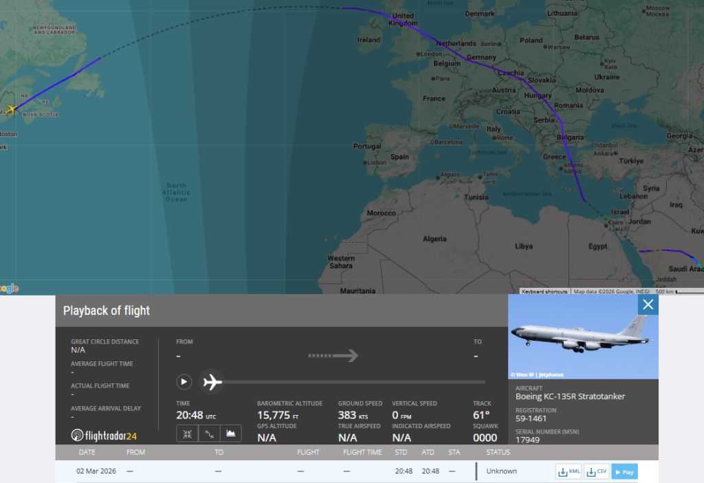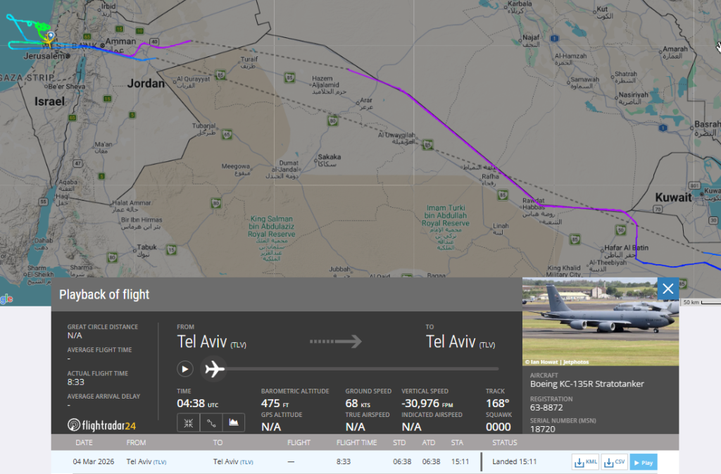 ففي الأول من مارس، اليوم الثاني للحرب على إيران، رصدنا طائرة أمريكية للتزود بالوقود، تحمل رقم تسجيل 623513، أقلعت من قاعدة Chania International Airport (أو IOAKannis Airport)، وهي قاعدة جوية يونانية مزدوجة الاستخدام (مدني وعسكري) في جزيرة كريت، جنوب غرب مدينة خانيا (Chania) بحوالي 14 كم الشرقية. وعبرت المجال الأردني نحو السعودية، ثم اختفت من على الرادار على الحدود الأردنية السعودية.