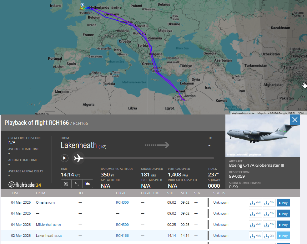 وفي منتصف نهار الثاني من مارس، حلقت طائرة أمريكية أخرى للشحن العسكري الثقيل من نفس الطراز، تحمل رقم تسجيل 990059، انطلقت من قاعدة RAF Lakenheath، وهي قاعدة جوية بريطانية تستضيف القوات الجوية الأمريكية في مقاطعة Suffolk بإنجلترا، شمال شرق لندن بحوالي 110 كم، وتُعدّ واحدة من أهم قواعد المقاتلات الأمريكية في أوروبا. وحلقت نحو السعودية، مطفئة إشارتها عند الحدود الأردنية السعودية.