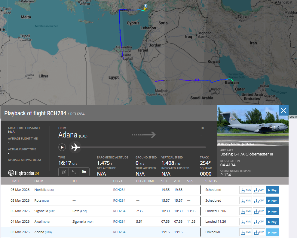 ثم، في الثالث من مارس، ظهر على الرادار، طائرة أمريكية أخرى للشحن العسكري الثقيل من نفس الطراز، حملت رقم تسجيل 044134ـ أقلعت من قاعدة إنجرليك في مدينة أضنا التركية، وعبرت المجال الجوي السعودي متجهة نحو البحرين.