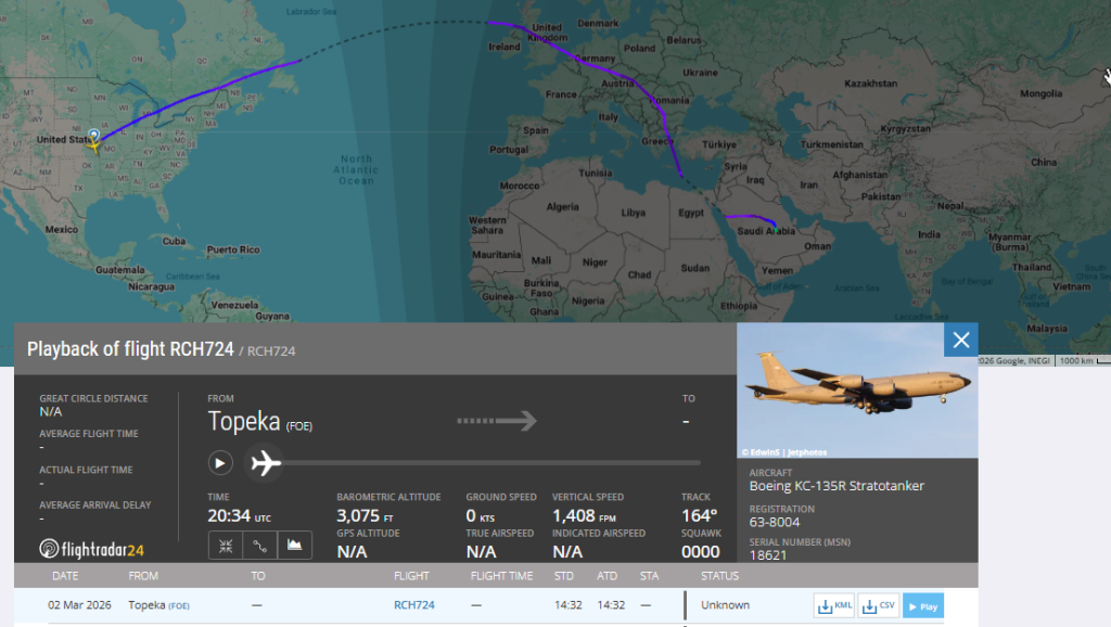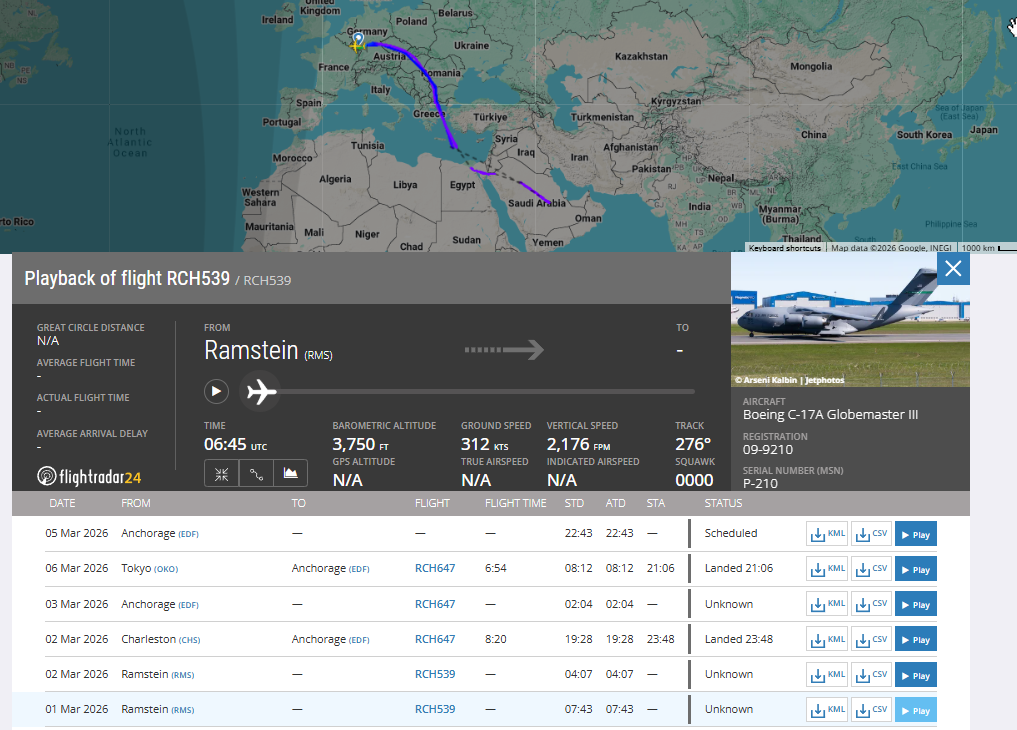 وصلت الطائرة الأولى التي تحمل رقم تسجيل 099210، إلى قاعدة الأمير سلطان بالسعودية في صباح الأول من مارس، قادمة من قاعدة “رامشتاين” بألمانيا، بالتزامن مع شن الطائرات الأمريكية والإسرائيلية هجمات جوية على إيران ورد إيران بقصف صاروخي استهدف إسرائيل والقواعد الأمريكية بدول الخليج.