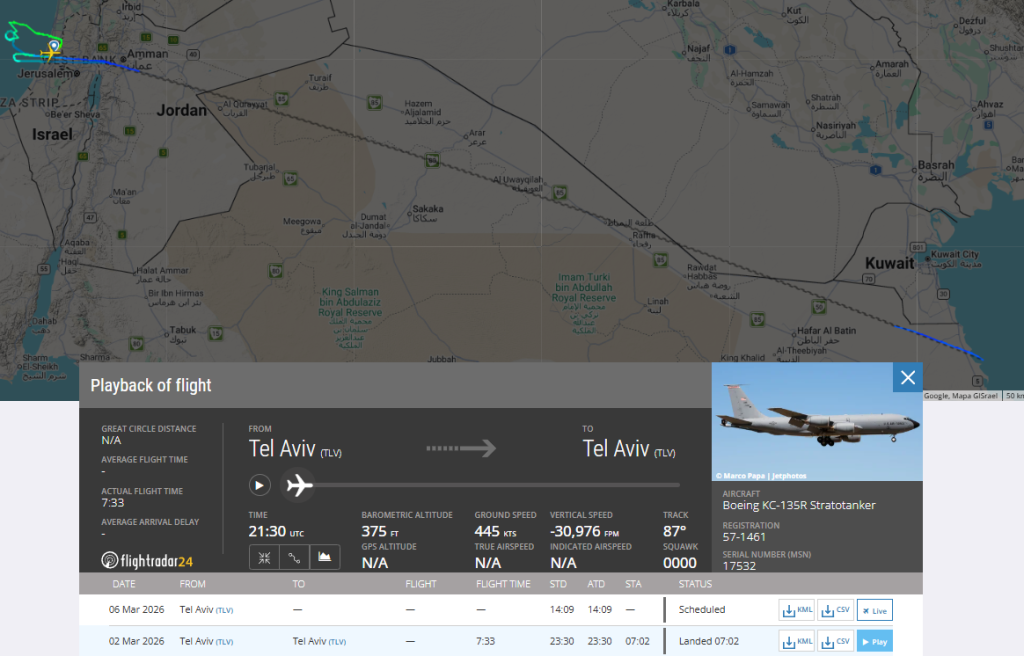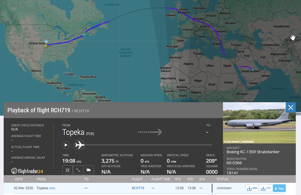في مساء الثاني من مارس، ظهر على الرادار طائرة أمريكية مخصصة للتزود بالوقود من نفس الطراز، تحمل رقم تسجيل 591495، تحوم فوق إسرائيل والأردن، ما يشير لقيامها بمهمة تزويد بالوقود.