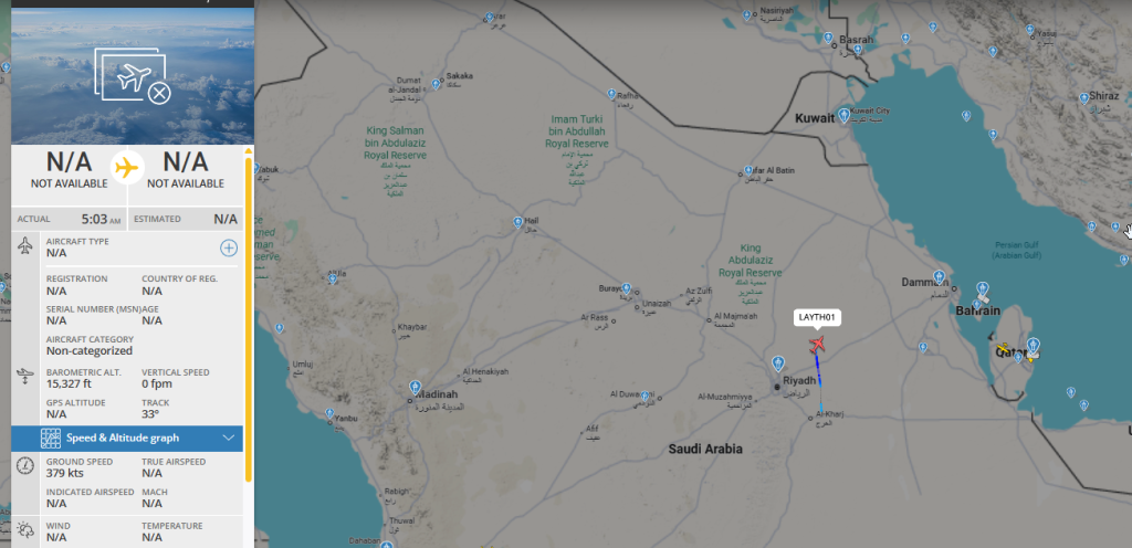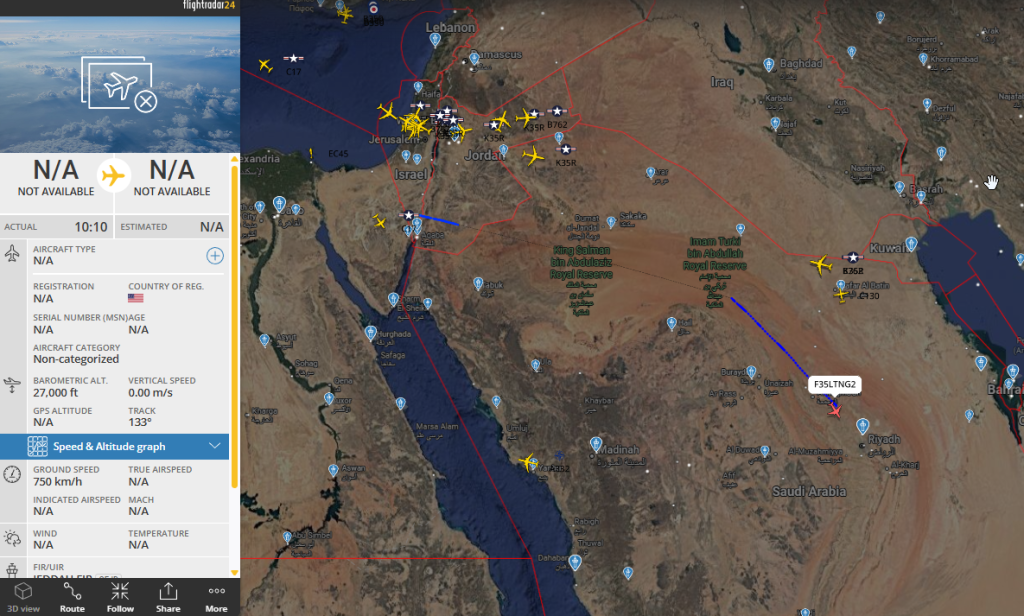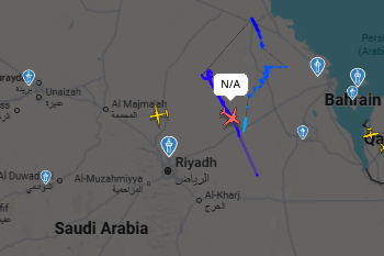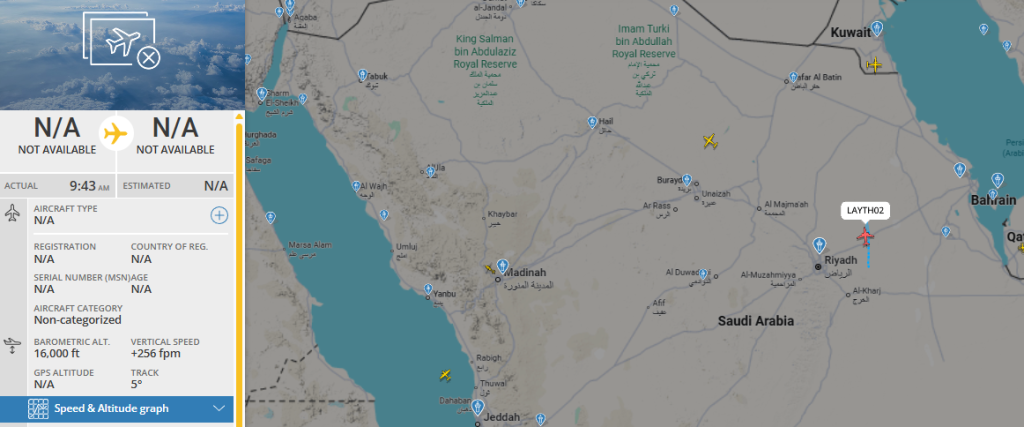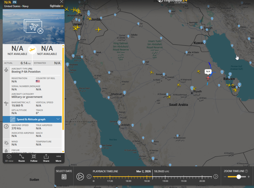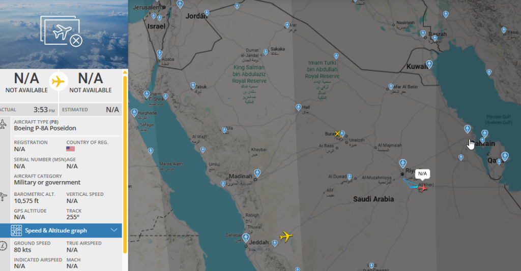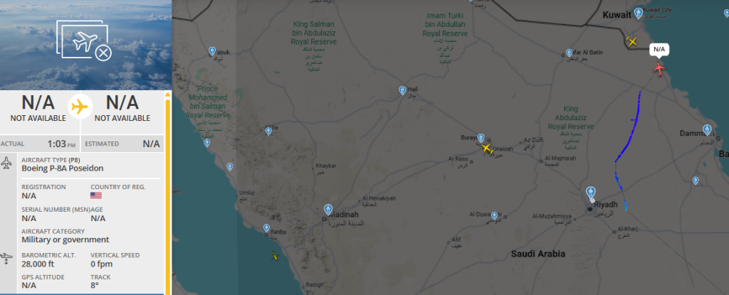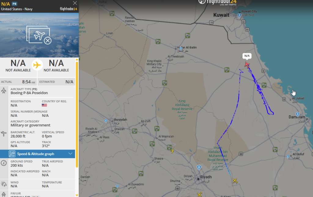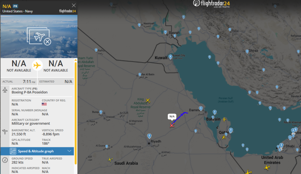 في الوقت نفسه، رصدنا طائرة عسكرية مجهولة انطلقت من قاعدة الأمير سلطان بالسعودية، وحلقت نحو الساحل الشرقي، في مسار مشابه لطائرة Boeing P-8A Poseidon، مطفأة إشارتها ومخفية جميع بياناتها، وبعد ساعة رُصدت عائدة إلى قاعدة الأمير سلطان.