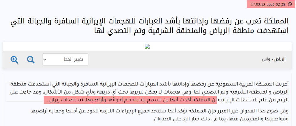بينما أعربت السعودية عن رفضها وإدانتها لتلك الهجمات، وعلقت بأن الهجمات الإيرانية “لا يمكن تبريرها تحت أي ذريعة وبأي شكل من الأشكال”، موضحة أن السلطات الإيرانية تعلم أن “المملكة أكدت أنها لن تسمح باستخدام أجوائها وأراضيها لاستهداف إيران”.