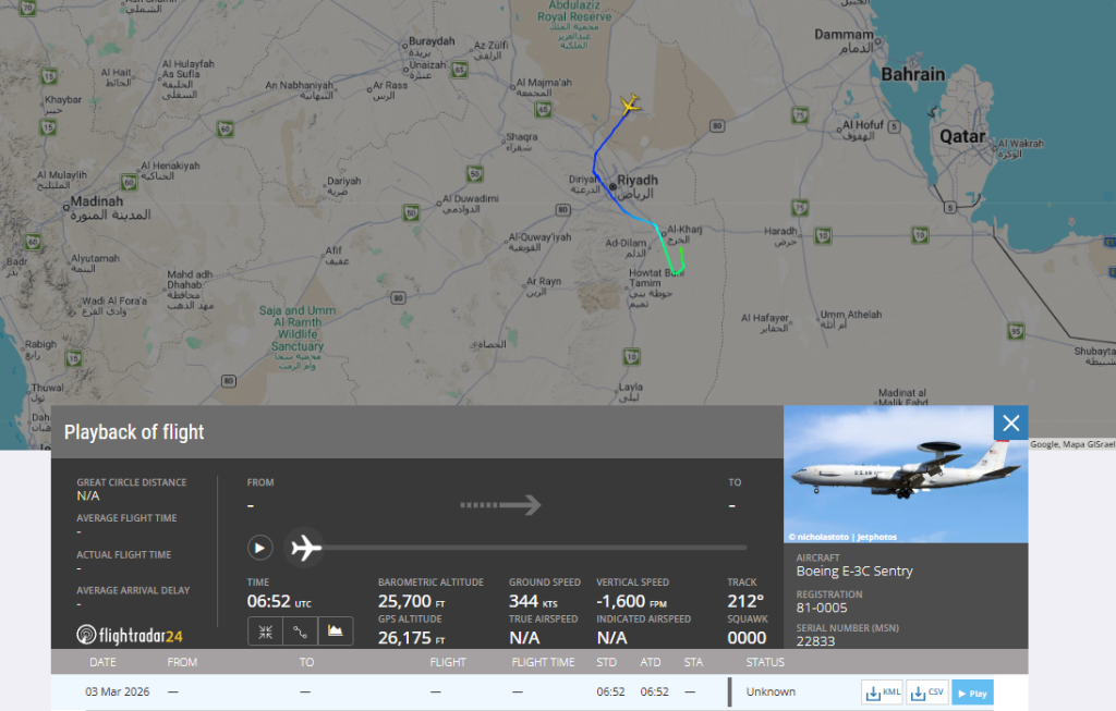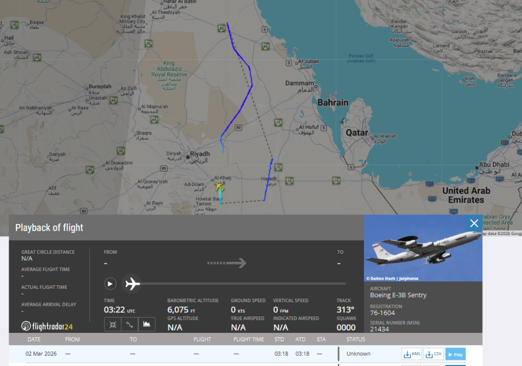 في الثالث من مارس رصدنا نشاط لطائرة أخرى من نفس الطراز، Boeing E-3C Sentry، عائدة إلى قاعدة الأمير سلطان، بعدما انطلقت منها في رحلة للمراقبة والتحكم الجوي. وكانت الطائرتان قد وصلتا إلى قاعدة الأمير سلطان في 19 فبراير الماضي من قاعدة “رامشتاين” الأمريكية بألمانيا، في سياق الحشد العسكري الأمريكي للحرب على إيران.