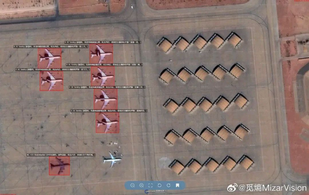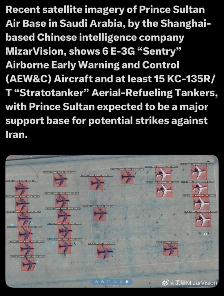 قبل ذلك، في 22 فبراير ، أظهرت صور أقمار صناعية صينية أخرى، وجود 20 طائرة للتزود بالوقود، 6 طائرات من طراز KC-46A و14 طائرة من طراز KC-135 ، بجانب 6 طائرات مراقبة وإنذار مبكر من طراز E-3 Sentry AWACS، بالإضافة إلى 3 طائرات اتصالات متقدمة من طراز (E-11A (BACN في قاعدة الأمير سلطان بالسعودية.