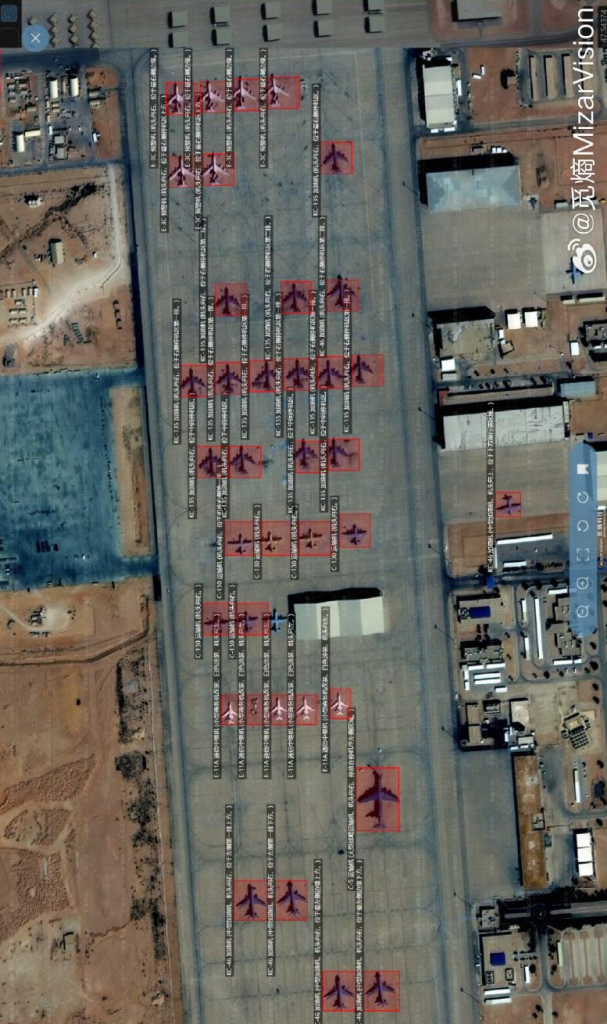 شوهدت هذه الطائرات في صور قمر صناعي نشرتها شركة صينية، أظهرت عدد كبير من طائرات الشحن العسكري الأمريكية وطائرات للتزود بالوقود بمدرج القاعدة. إذ أظهرت صور القمر الصناعي 16 طائرة تزويد بالوقود أمريكية و 6 طائرات إنذار مبكر وتحكم جوي من طراز سنتري E-3.