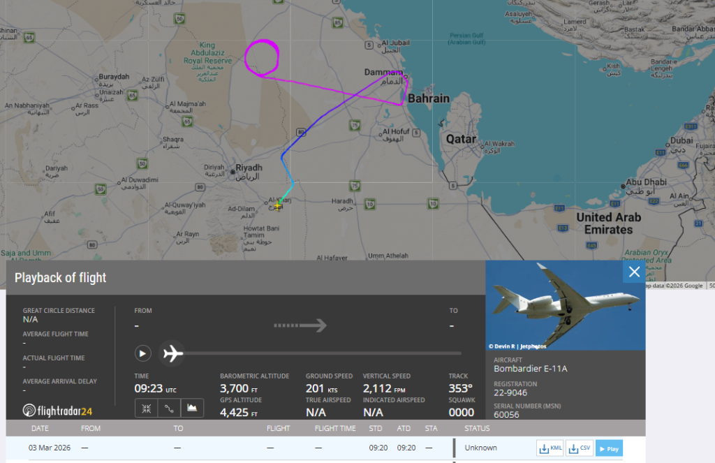 في الثالث من مارس، رصدنا طائرة أخرى أمريكية انطلقت من قاعدة الأمير سلطان، وحلقت مخفية بياناتها فوق منطقة الدمام شرق السعودية، وأظهر سجل الطائرة أنها من طراز Bombardier E-11A وحملت رقم تسجيل 229049.