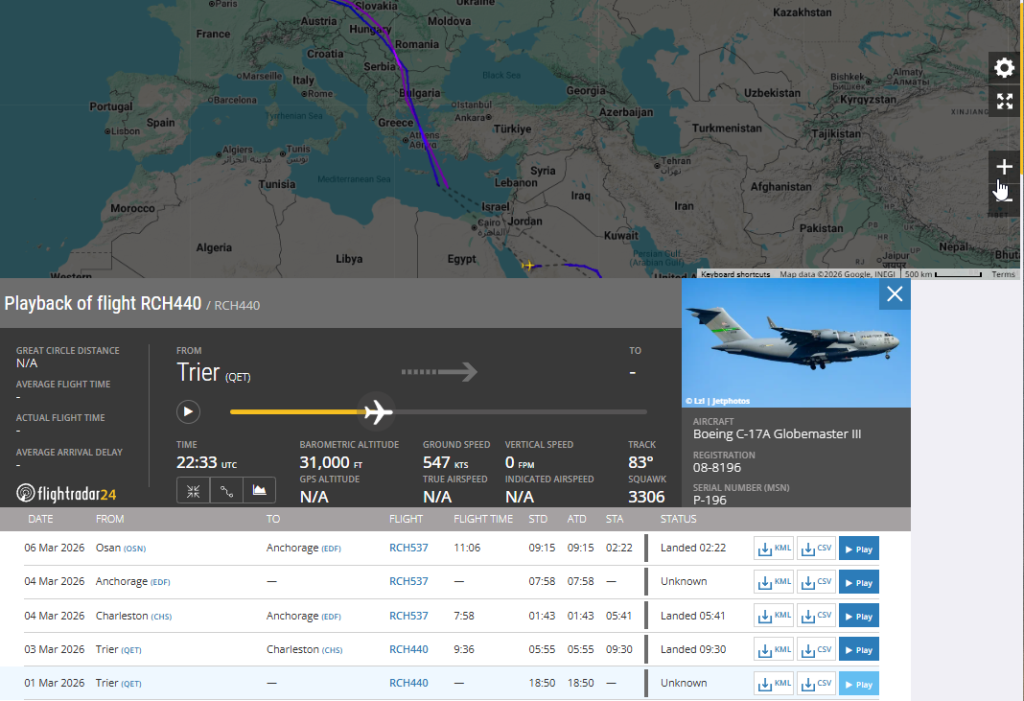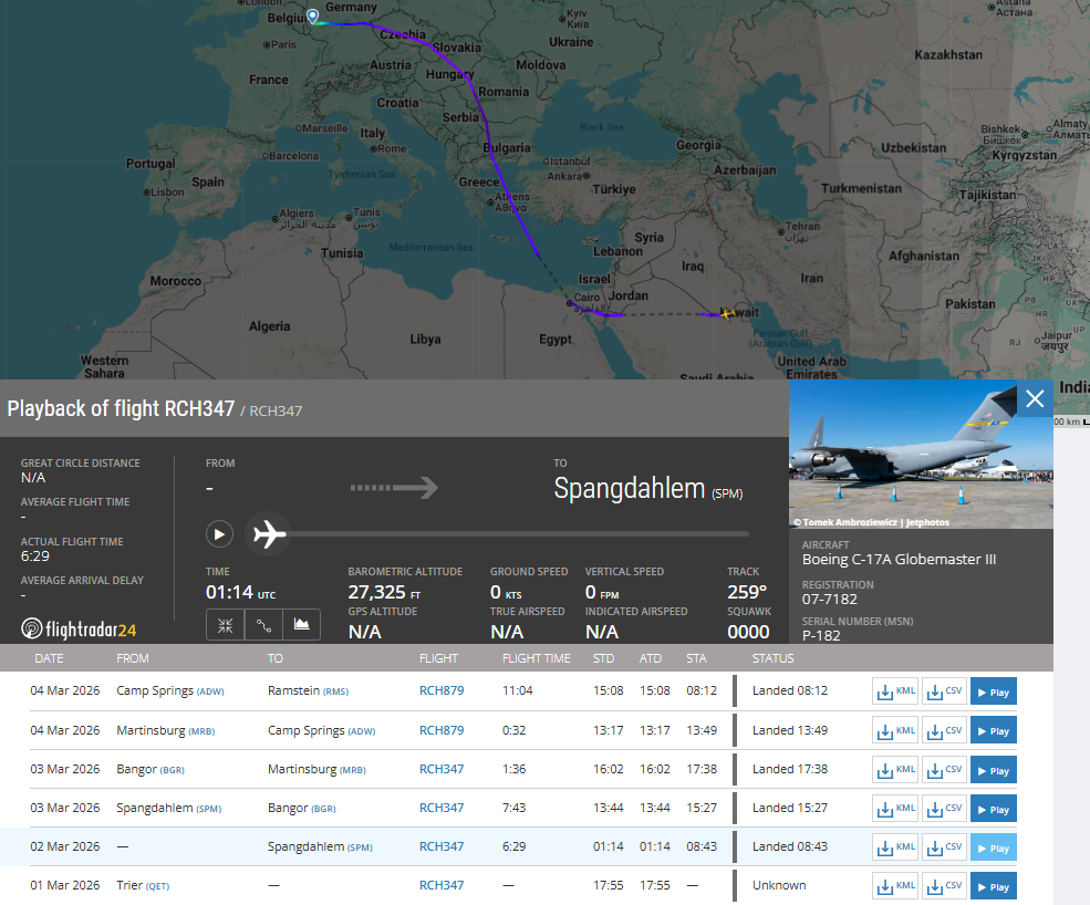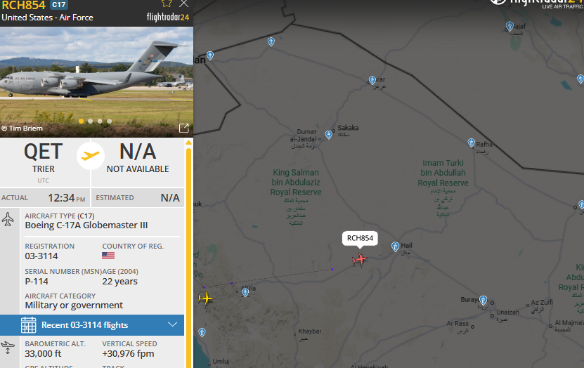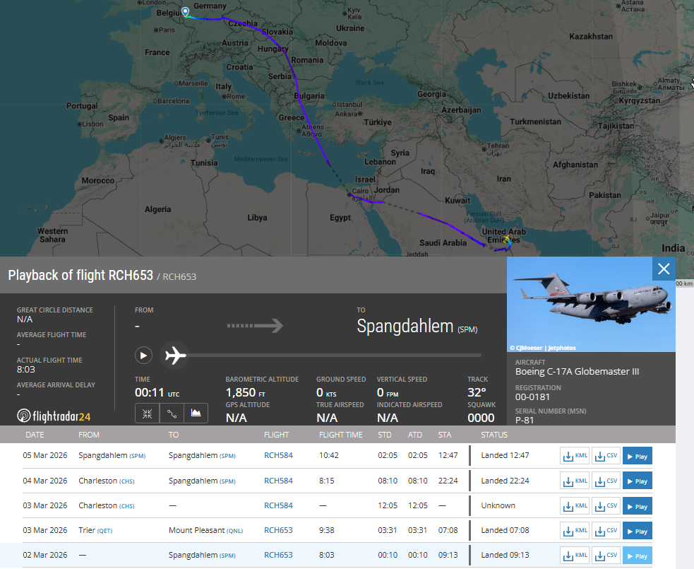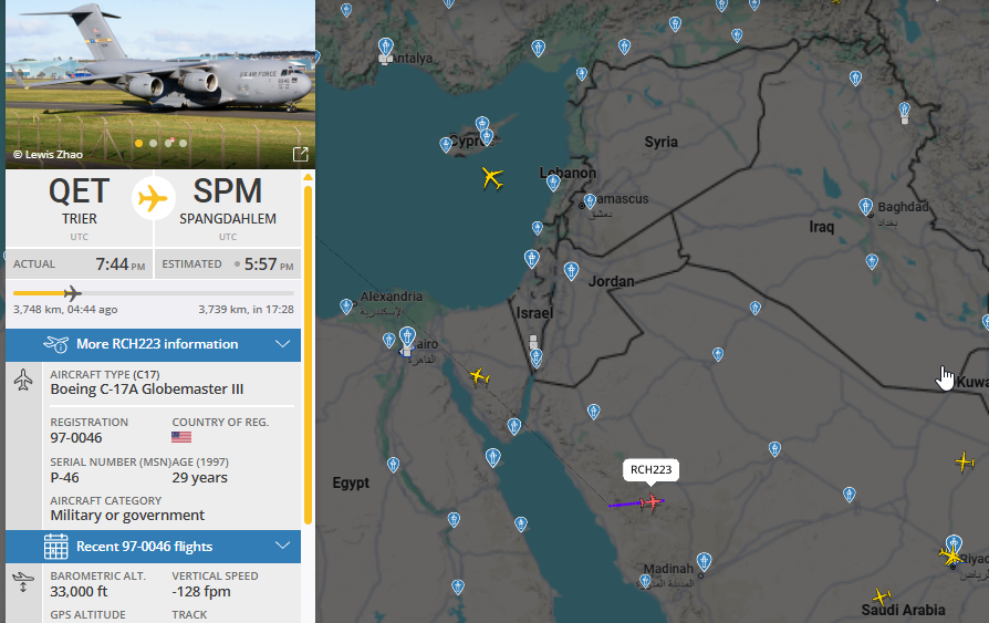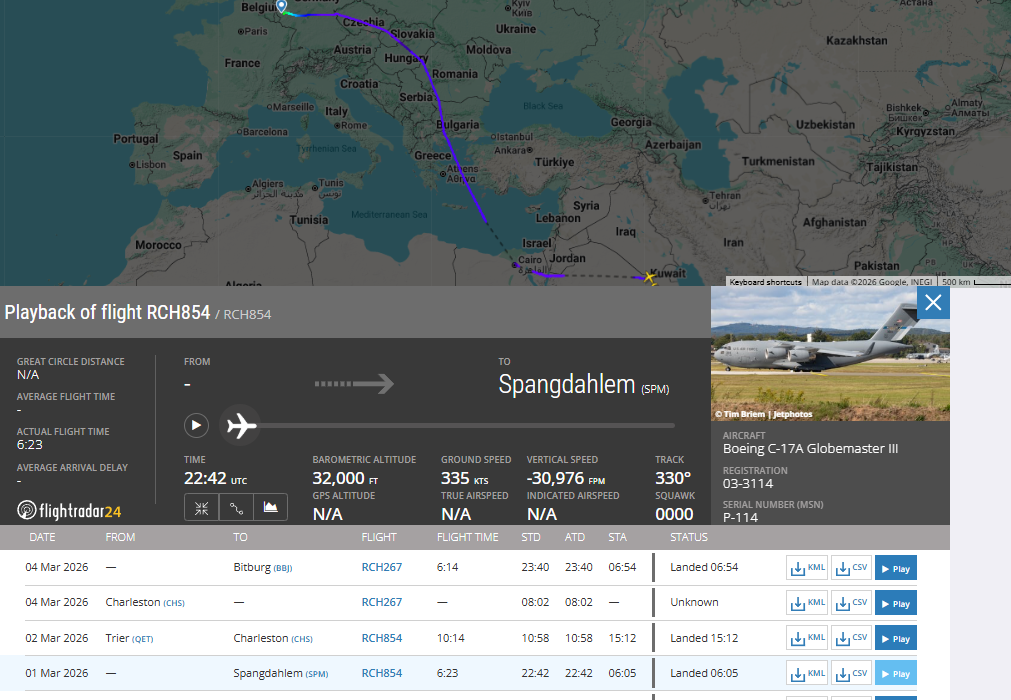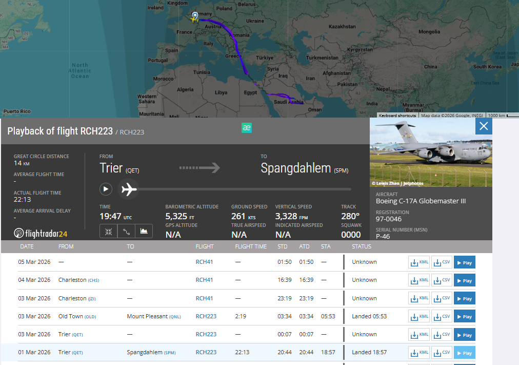 أما طائرة الشحن الرابعة التي حلقت بالمجال الجوي السعودي في الأول من مارس، فقد حملت رقم تسجيل 033114، وأتت من قاعدة Spangdahlem Air Base، وهي قاعدة جوية أمريكية نشطة في راينلاند-بفالز بألمانيا، تقع شمال شرق مدينة ترير بحوالي 30 كم، وتُعدّ جزءًا حيويًا من بنية الناتو في أوروبا. وظهرت الطائرة بالمجال الجوي السعودي متجهة نحو الكويت.